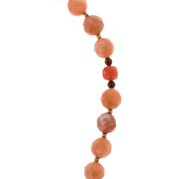 Мусульманские чётки из гелиолита и авантюрина «Аллах Велик» — изысканное воплощение духовного символизма и природной красоты. Каждая гранёная бусина отражает мягкий свет, создавая эффект внутреннего сияния, словно напоминание о свете веры, освещающем путь человека. Тёплый персиково-золотистый оттенок камней символизирует покой, гармонию и благодарность, а их естественная энергия помогает сосредоточиться в молитве и обрести душевное равновесие.