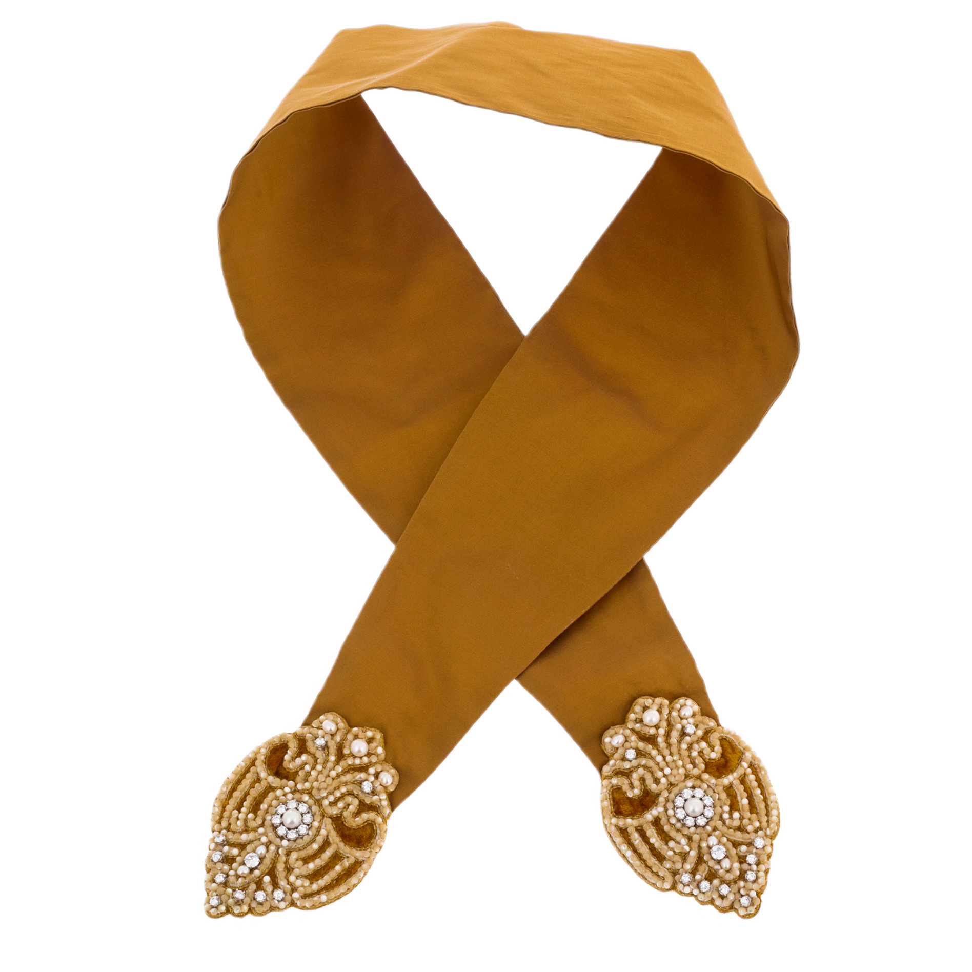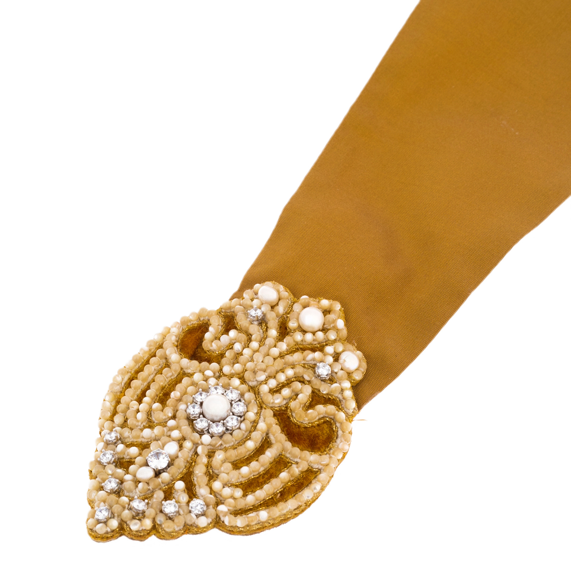 Этот косник выполнен из благородного текстиля насыщенного коричного оттенка — цвета, что издавна ассоциируется с теплотой, уверенностью и мудростью. Края венчают изысканные вышитые элементы, созданные вручную из жемчуга и мельчайшего бисера, подобно драгоценному шитью царских одежд. Каждая жемчужина играет бликами, словно капли утренней росы, собранные в утренней тишине старинного русского леса. Орнамент, исполненный мастерством лучших ремесленников, напоминает о наследии древних русских узоров, где каждый завиток хранит тайный смысл, скрытый от постороннего взгляда.