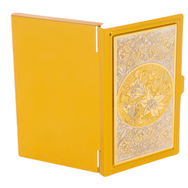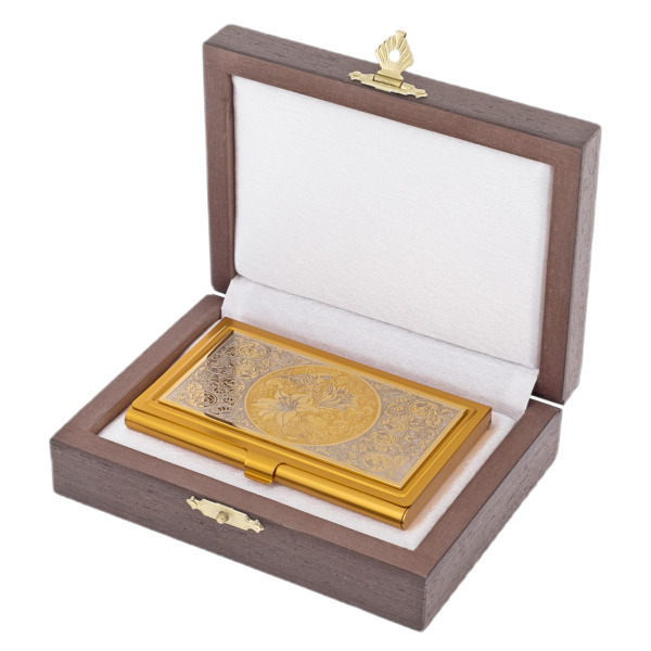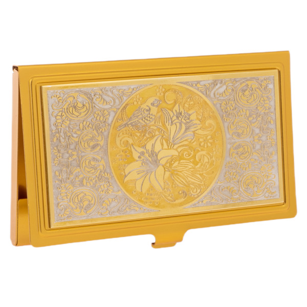 Эта визитница — истинный гимн изысканности и власти, заключённый в компактной форме. Её корпус, выполненный из металла с роскошным золотым покрытием, подобен солнечному лучу, пробивающемуся сквозь строгие очертания делового мира. Центральное место композиции занимает утончённый цветочный орнамент, создающий эффект витража, где каждый элемент гравировки словно оживает, перенося вас в мир, где гармония природы встречается с человеческим искусством.