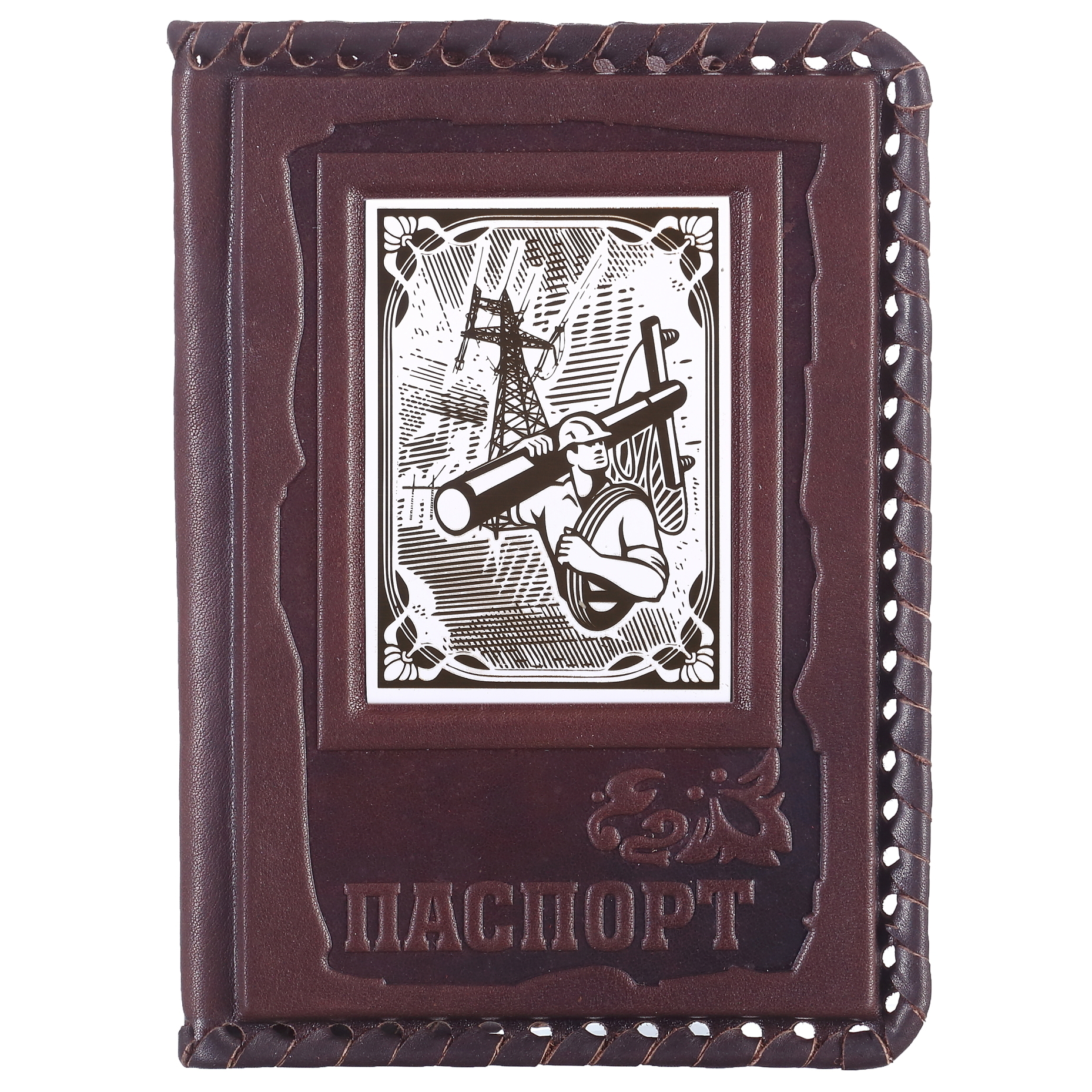Обложка для паспорта в кожаном переплете "Энергетику-3" с накладкой, покрытой никелем
