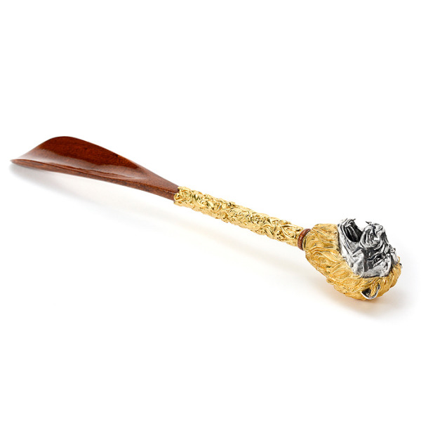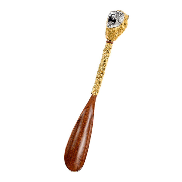Ручка рожка выполнена из серебра в виде львиной головы с позолоченной гривой. Вдоль ручки расположен изящный объемный узор, выполненный так же в серебре с позолотой. Сама ложка выполнена из древесины падук.