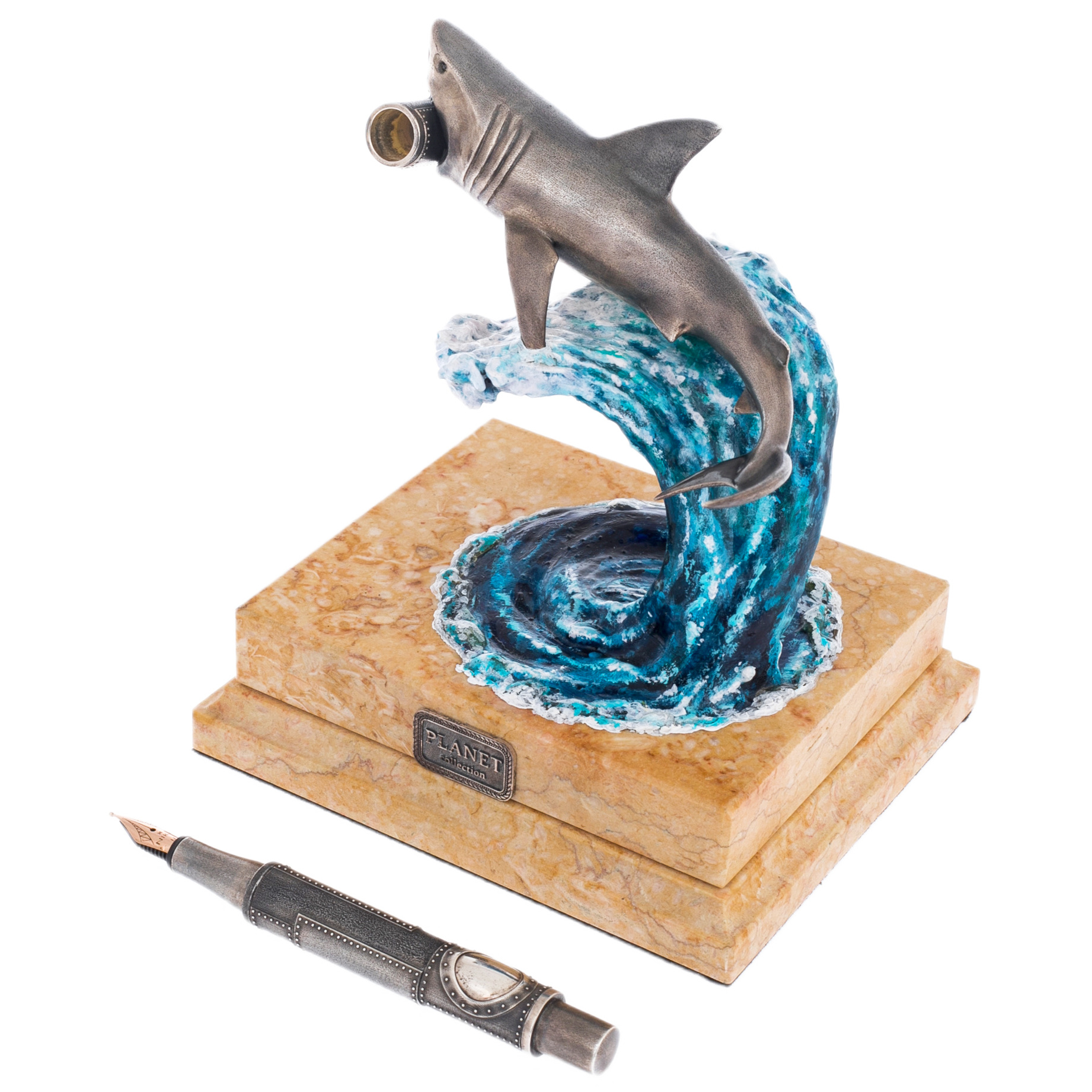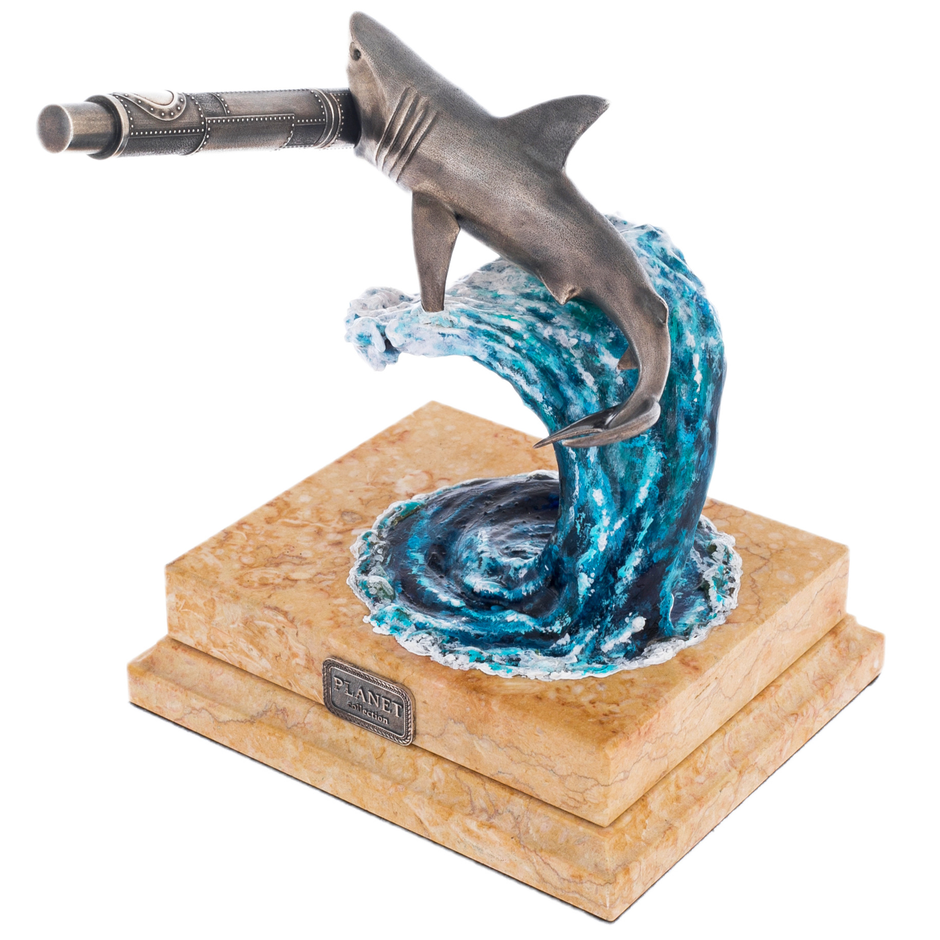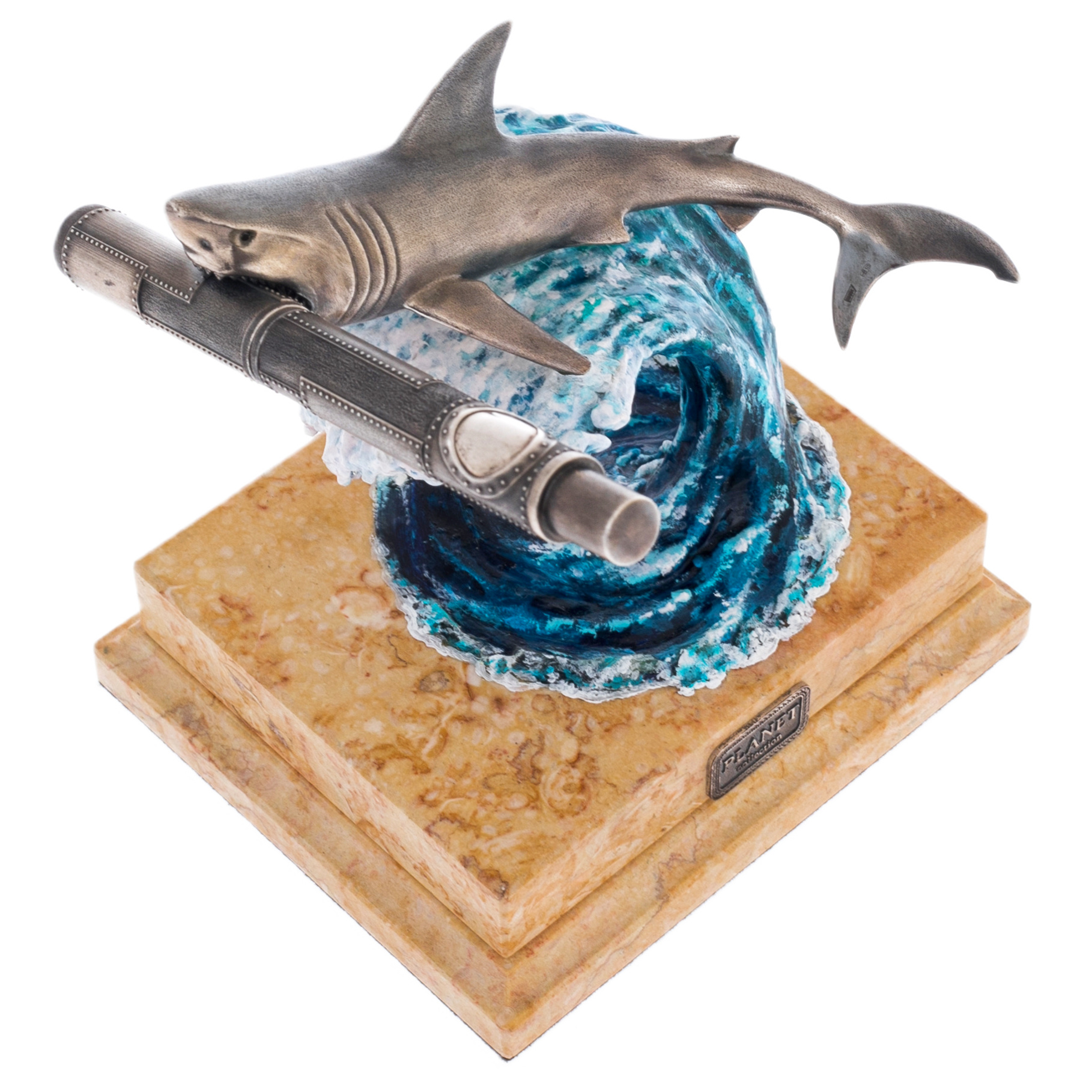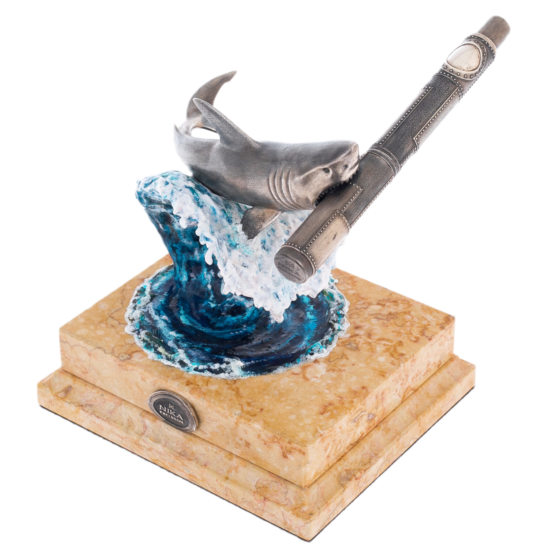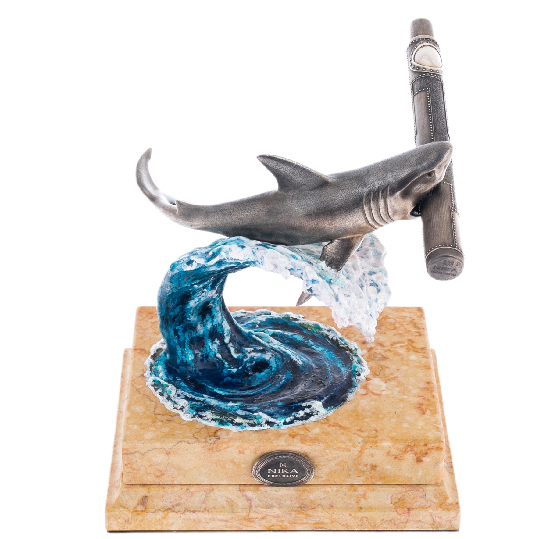 Волна, на которой расположена композиция, создана из полимерной смолы и расписана художником-маринистом Мариной Кусраевой. Ее рука мастерски передала игру света и тени, наполняя композицию движением воды и напоминанием о неукротимой силе природы. Постамент из светлого мрамора завершает образ, добавляя устойчивости и гармонии, а серебряные медальоны на его боках с логотипом NIKA EXCLUSIVE и названием серии PLANET подчеркивают принадлежность изделия к коллекции, посвященной животным нашей планеты.