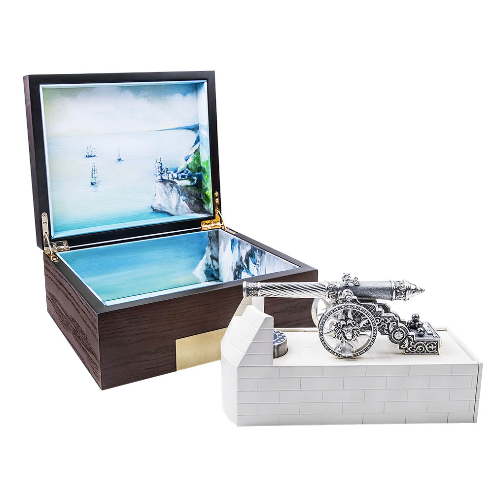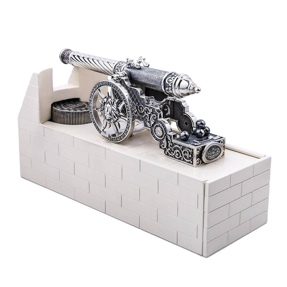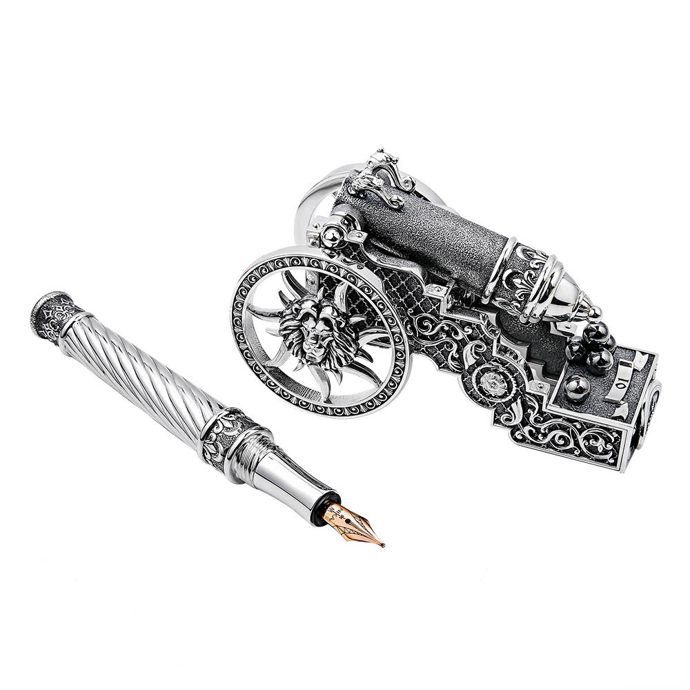 Игра с историческими миниатюрами доставляет удовольствие и взрослым, и детям – особенно когда в них есть подвижные элементы вроде колес этой пушки. Деревянные футляры расписаны вручную, каждый сюжет представлен в единственном экземпляре. В подарочную комплектацию входят: чернильница с крышкой из серебра 925º с чернением, серебряный зажим для денег, запасной конвертер.