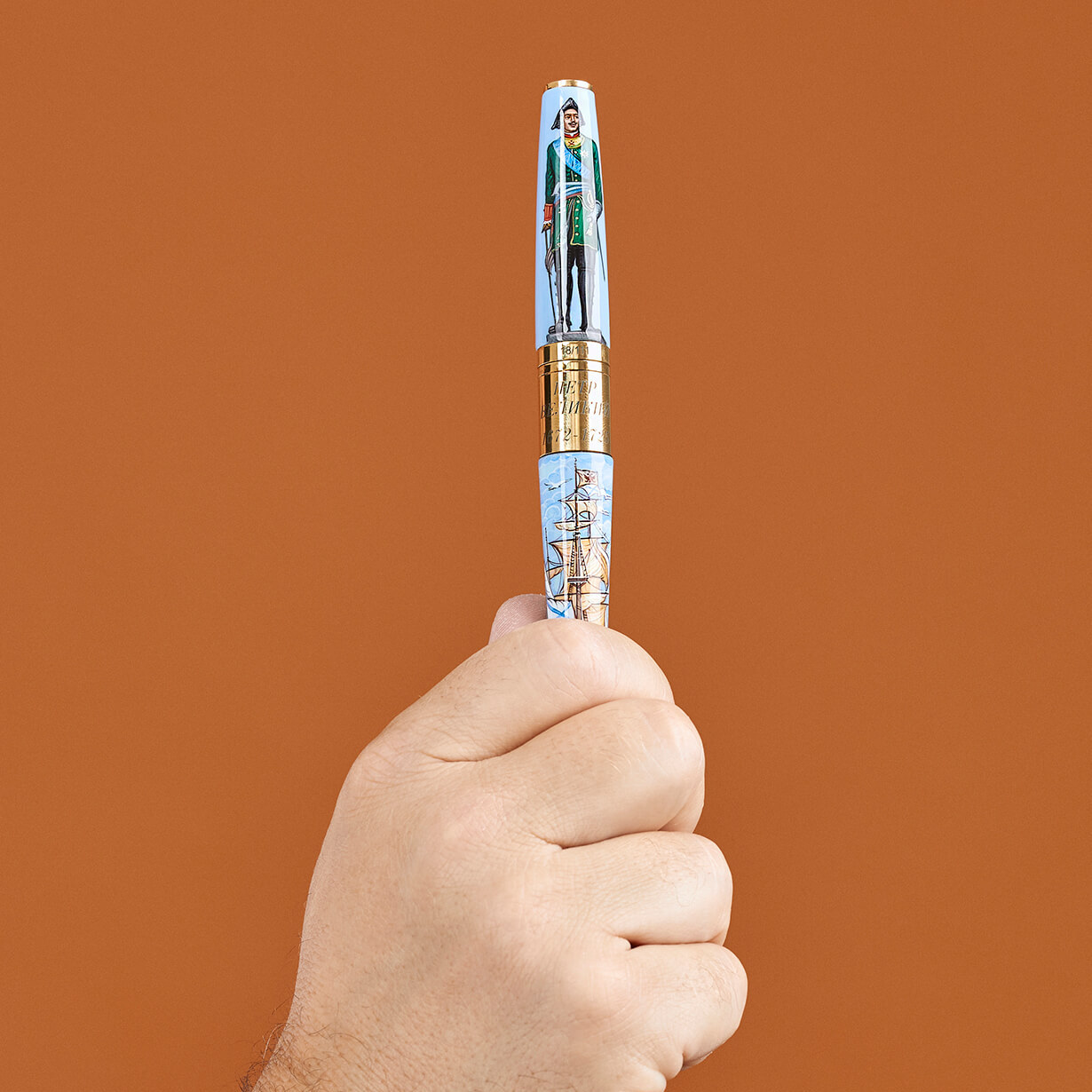 В основе художественного решения ручки «Петр Великий», выпущенной к празднованию 350-летия со дня рождения Петра I в 2022 году, лежит изображение первого российского императора и знаменитого корабля "Полтава" работы мастеров лаковой миниатюры Холуйской художественной фабрики.