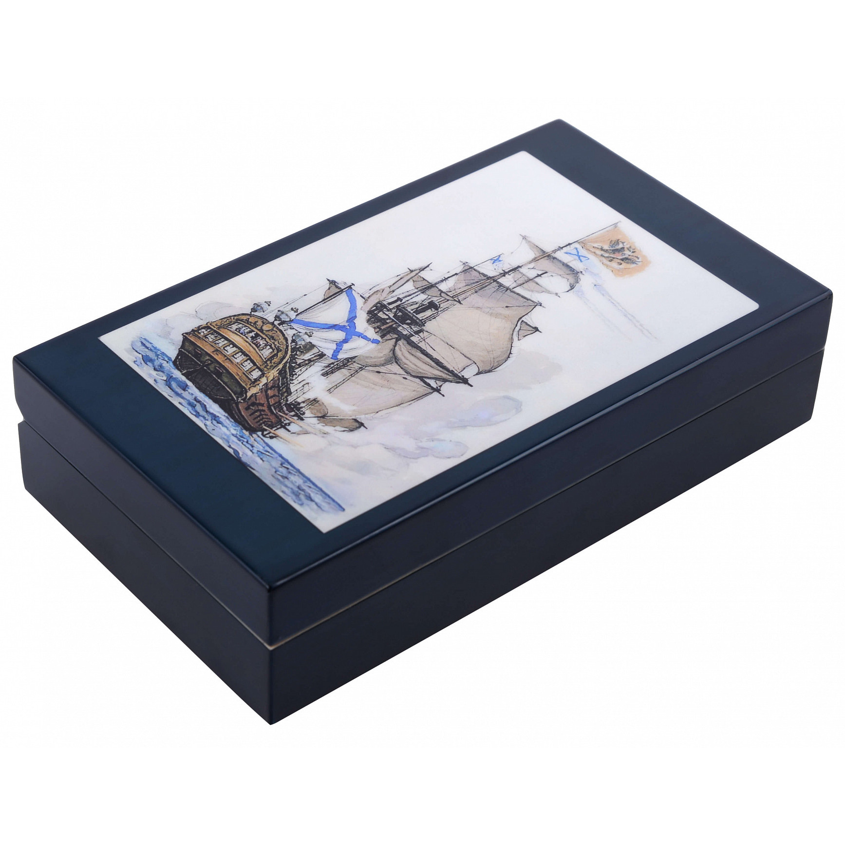 Ручка представлена в коробке из дерева с изображением фрегата "Полтава".