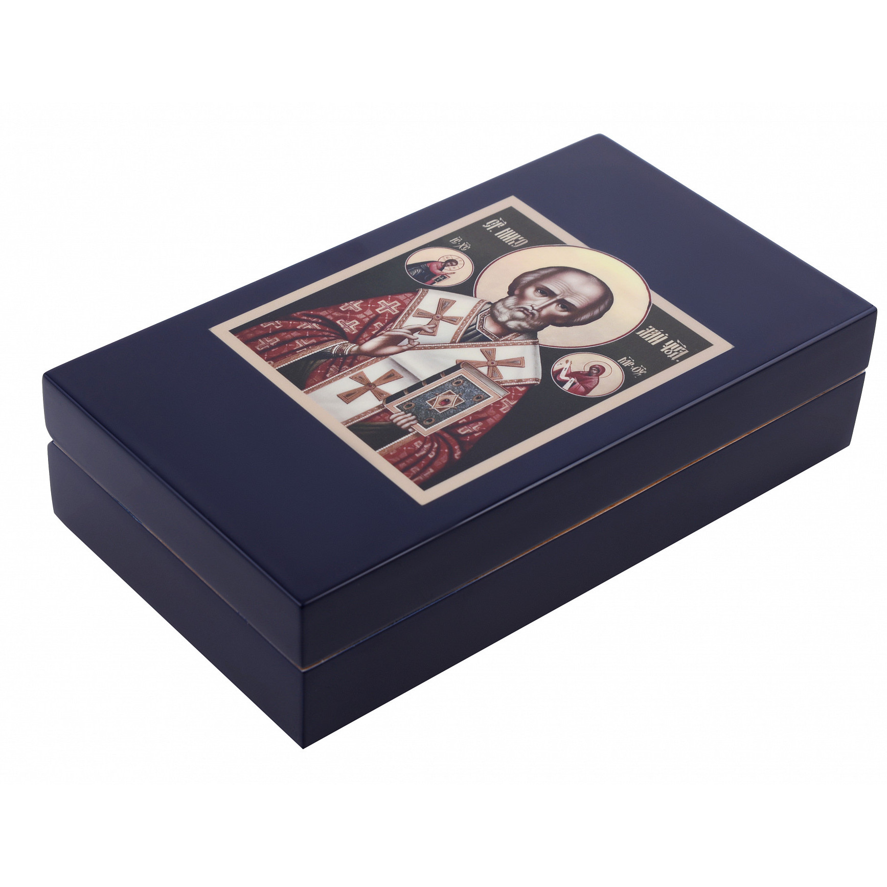 Коробка с изображением Николая Чудотворца с житием имеет специальное отделение для запонок этой же серии.