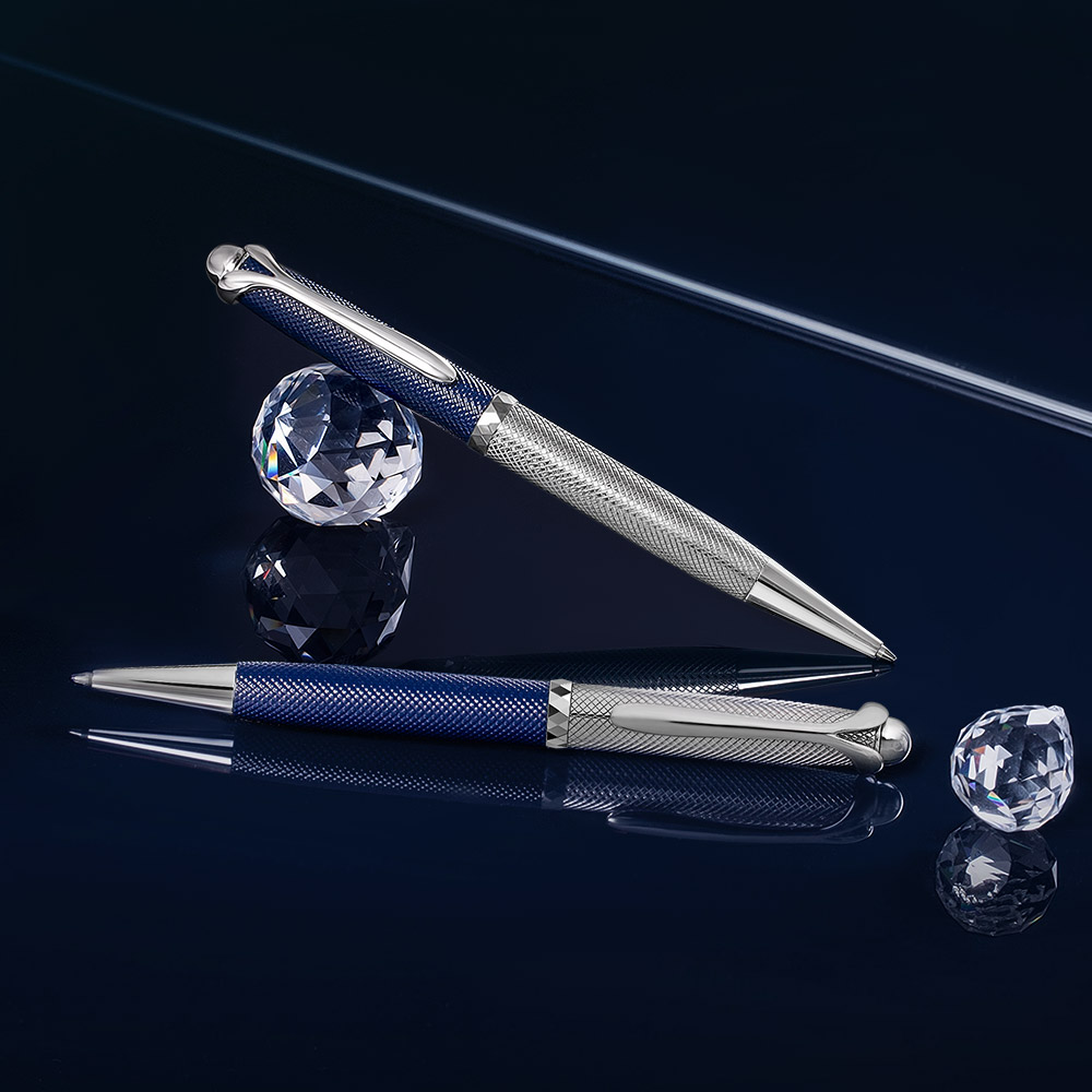 Серебряная ручка-роллер «Day R048102» — это утончённый инструмент для тех, кто привык оформлять свои мысли с точностью и стилем. Корпус изделия выполнен из серебра с чередованием гладких и фактурных поверхностей, создающих игру света и глубины. Нижняя часть корпуса покрыта гильоше тёмно-синего цвета с изящным микрорельефом, напоминающим ткань дорогого костюма, а верх украшен классической сетчатой гравировкой. Баланс ручки выверен таким образом, чтобы движение по бумаге было лёгким, точным и почти незаметным.