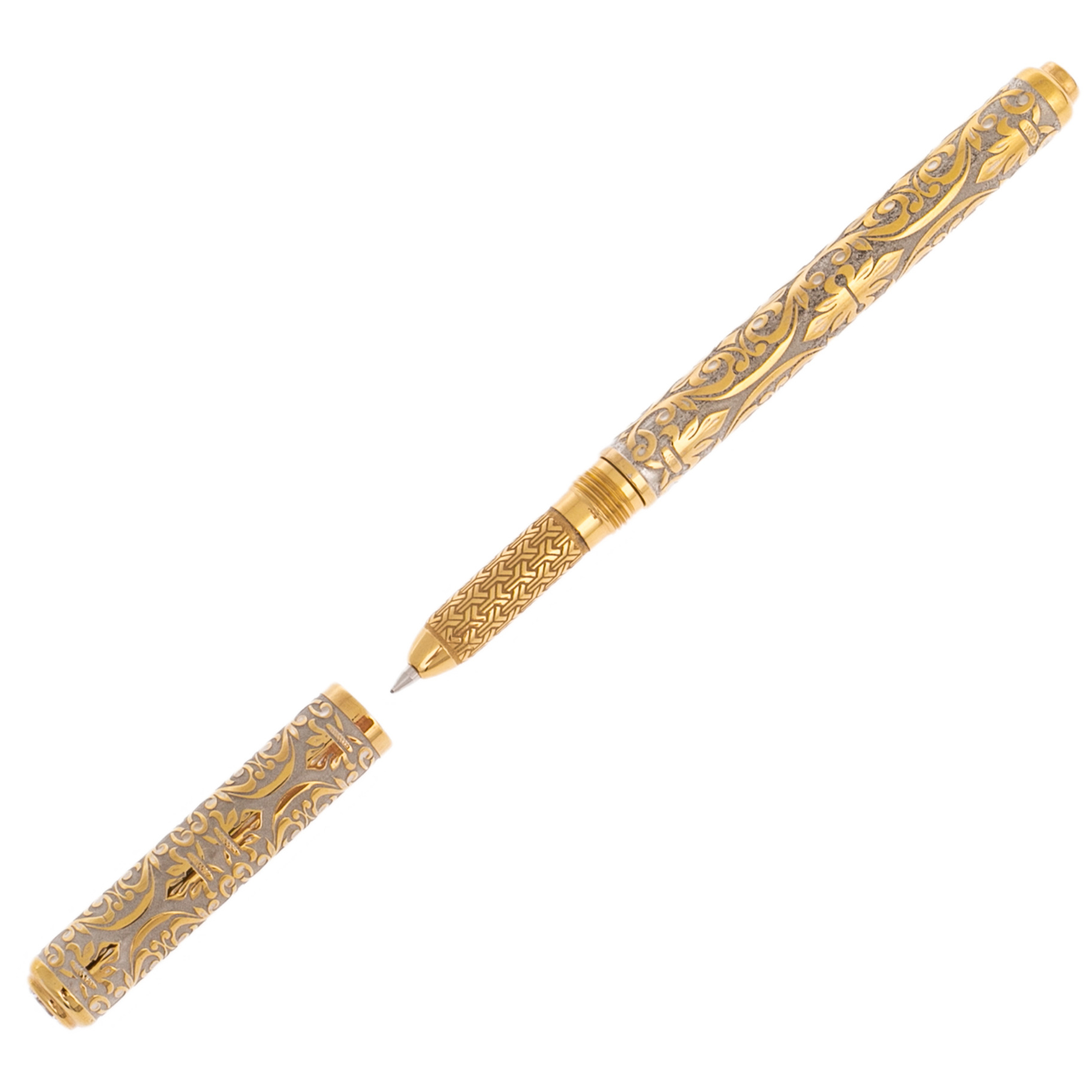 Златоустовская техника, применённая при создании этой ручки, восходит к XIX веку, когда мастера Урала изготавливали оружейные клинки, украшенные вручную резьбой по стали, покрытием золотом и серебром. Времена изменились, но изящество приёмов сохранилось. Поверхность корпуса покрыта гравировкой, выведенной по металлической основе, а затем вручную залитой золотом 999 пробы. Тончайшая работа над узором требует предельной точности: каждый изгиб, каждый изгрызок орнамента отточен до совершенства. Присутствие матовых и зеркальных элементов создаёт сложную игру света, оживляющую рисунок при каждом движении руки.