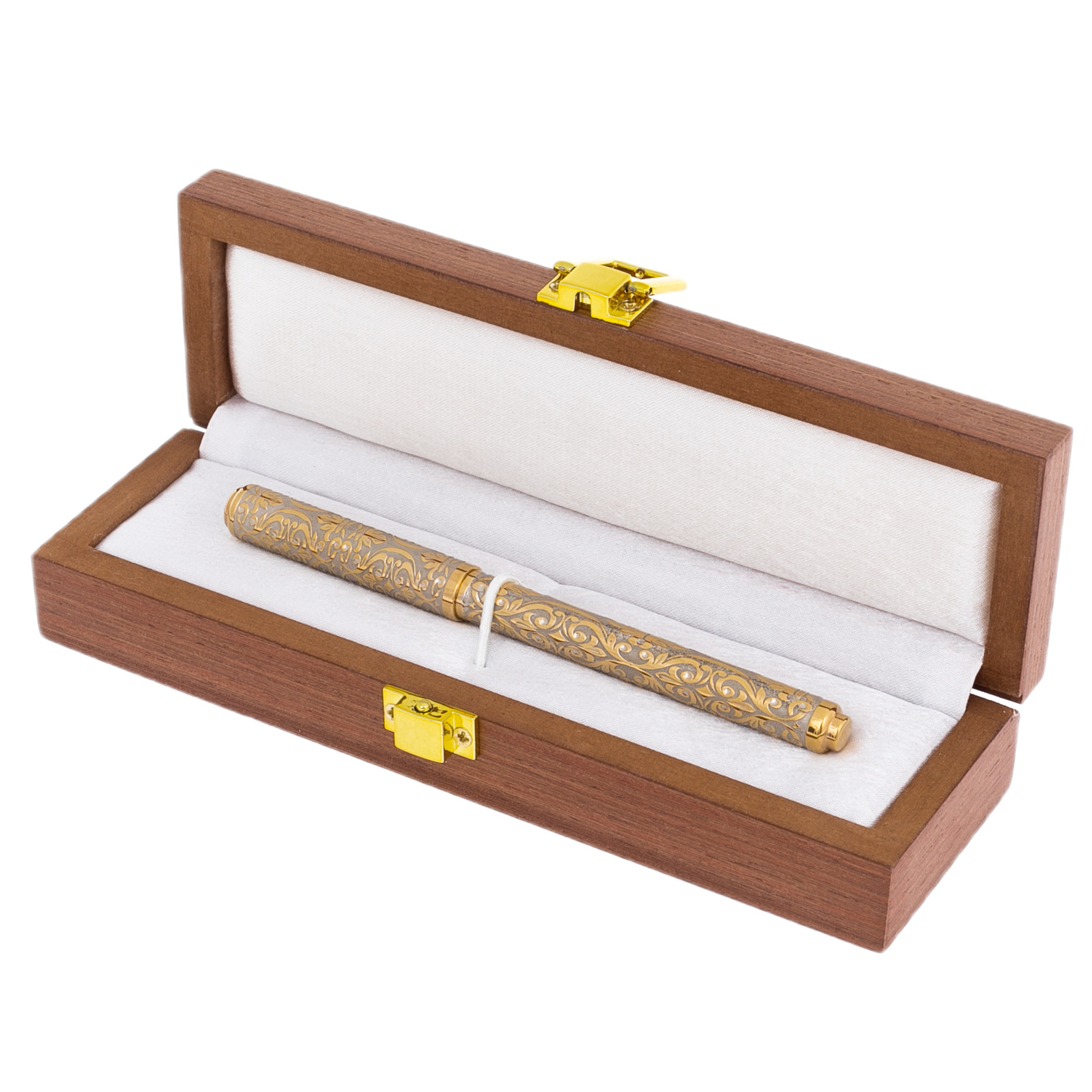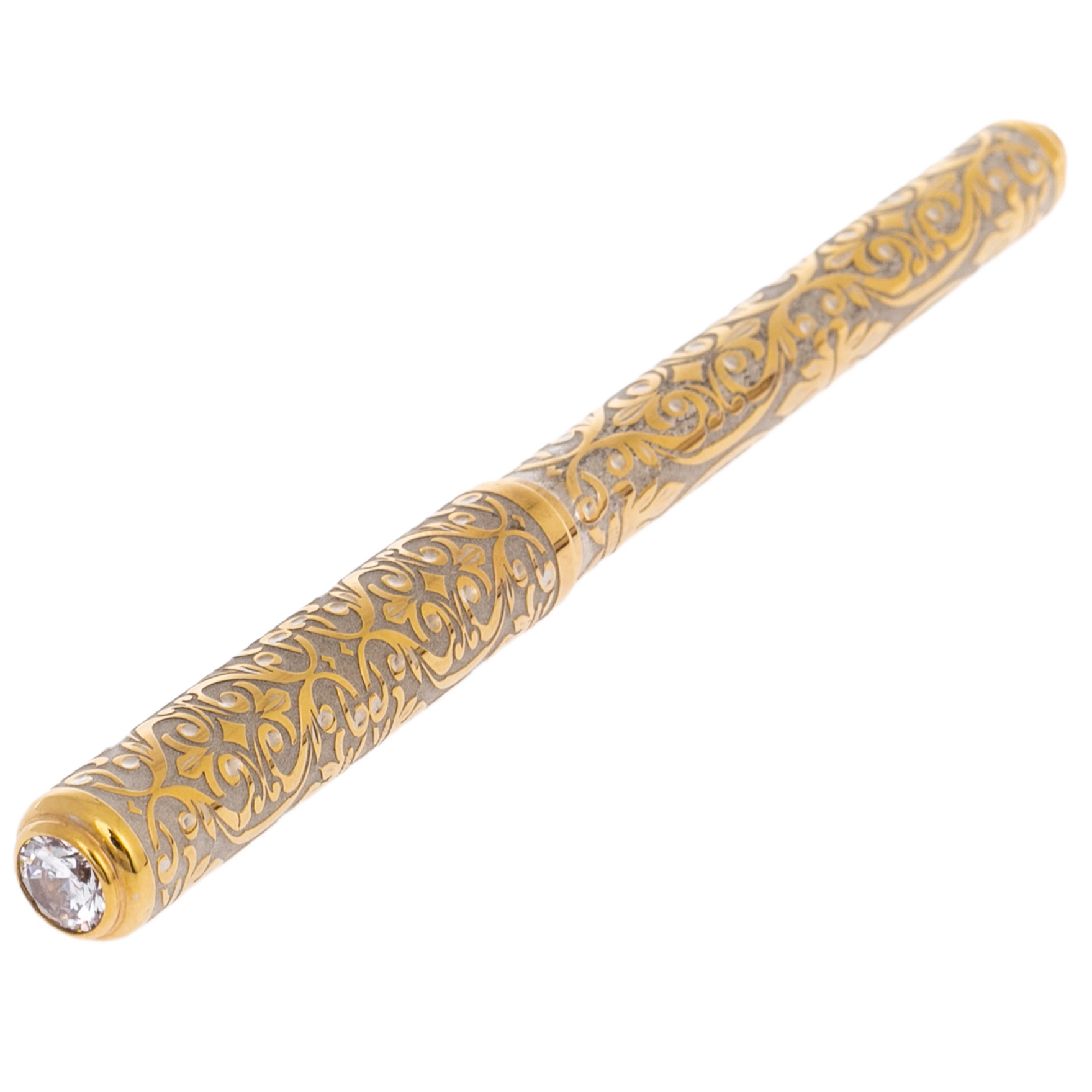 Шариковая ручка, исполненная в традициях златоустовского ювелирного дела, представляет собой не просто инструмент для письма — это воплощение статуса, силы и утончённого вкуса. Массивный корпус, отделанный вручную, обрамлён витиеватыми узорами, выполненными в технике травления, гравировки и золочения. Орнаментальный рисунок покрывает всю поверхность ручки, включая колпачок и зону хвата, где рельефный узор позволяет руке почувствовать истинное прикосновение к роскоши. В основании колпачка вмонтирован сверкающий фианит — финальный аккорд, подчеркивающий уникальность аксессуара. Такая ручка предназначена для кабинета человека, ведущего переговоры на уровне глав государств или совладельцев крупнейших корпораций. Она не подлежит забывчивости — её замечают, о ней спрашивают, её запоминают.