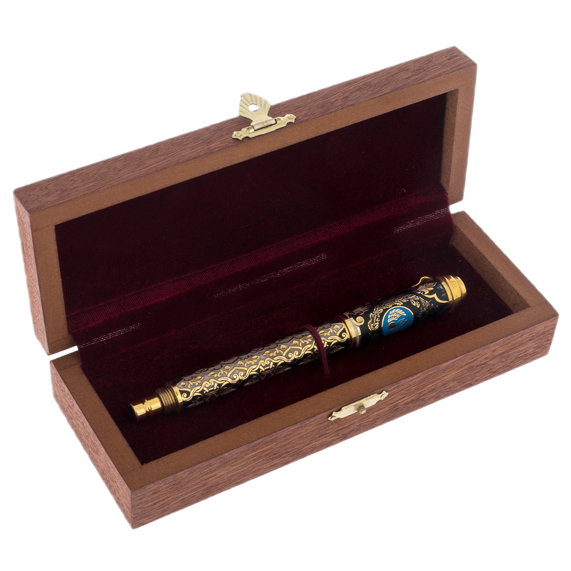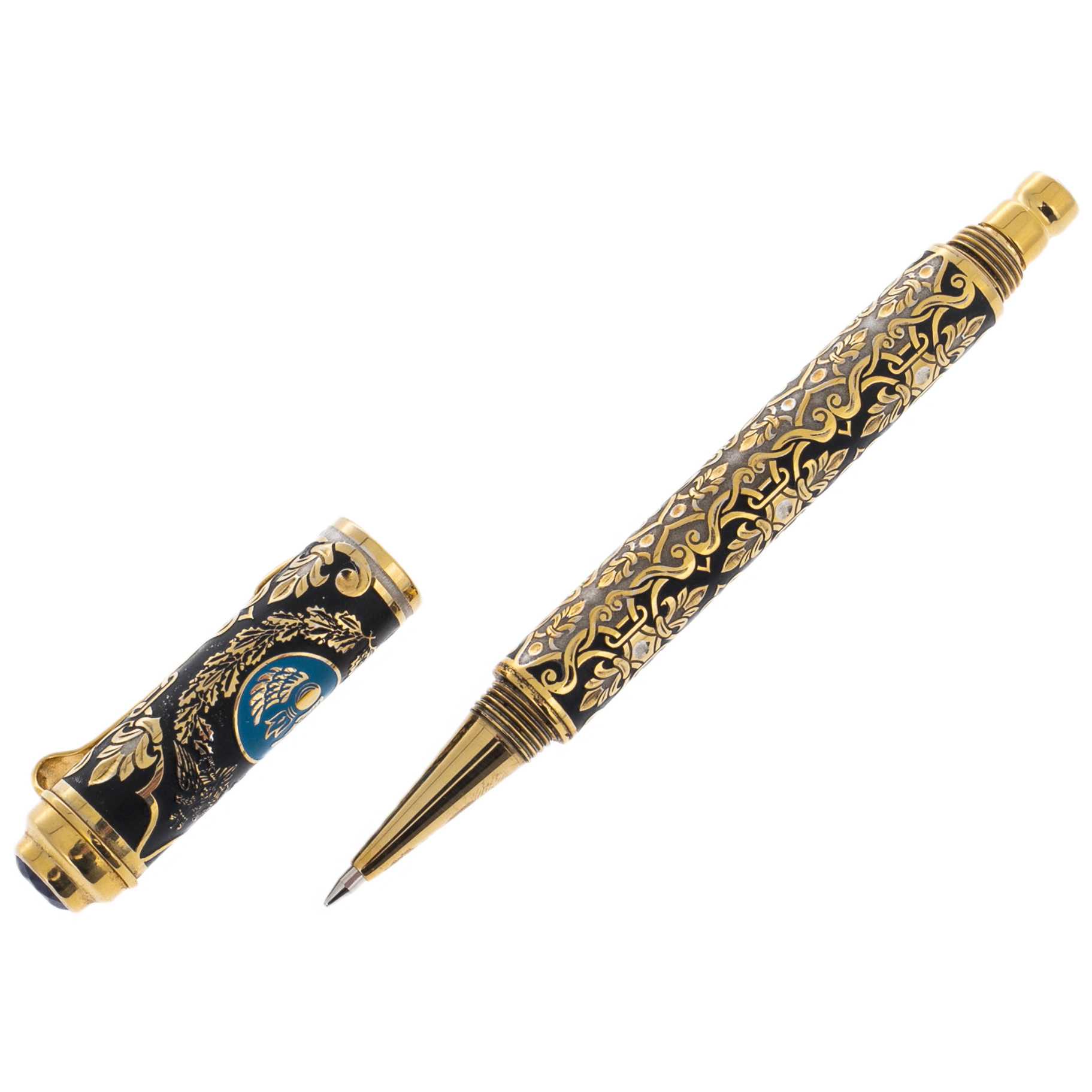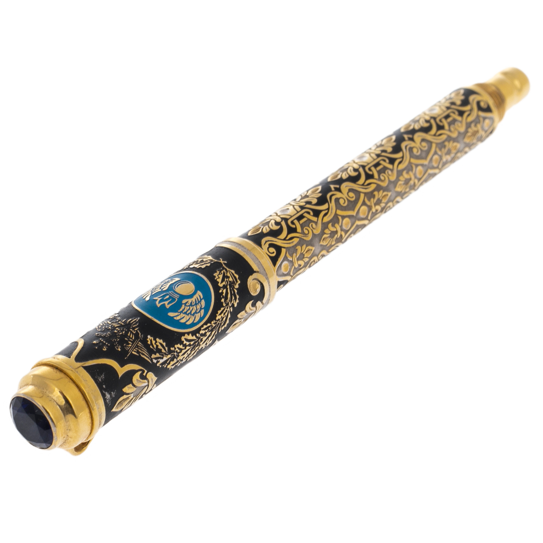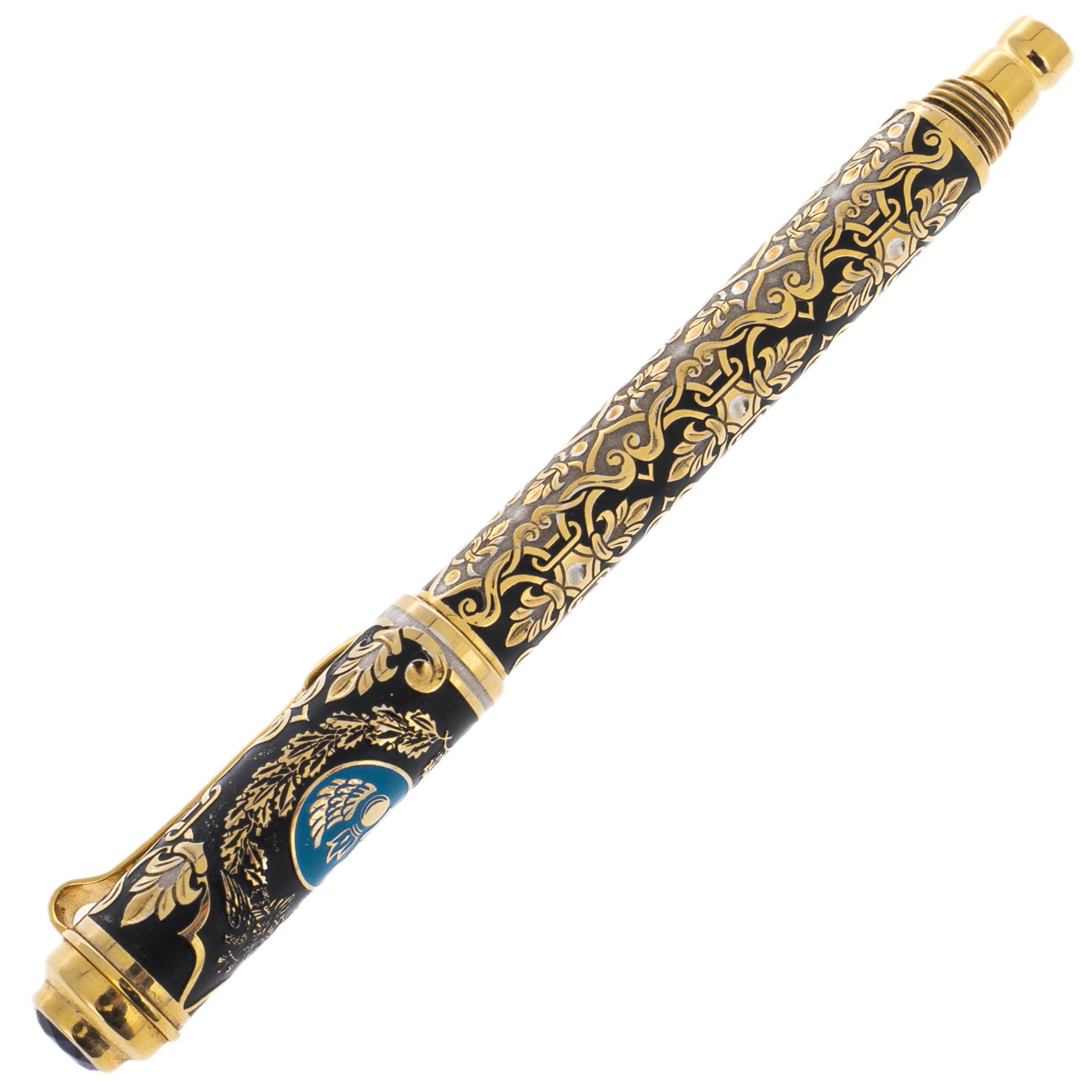 Тонкий корпус, покрытый глубоким чёрным лаком, сияет золотыми узорами, выполненными с филигранной точностью златоустовской гравировки. Изящные орнаменты, словно поток ветра, обтекают поверхность, превращая обычный инструмент письма в настоящее произведение искусства. Линии плавно перетекают одна в другую, создавая ощущение движения и живости, как будто сама ручка стремится к покорению вершин.