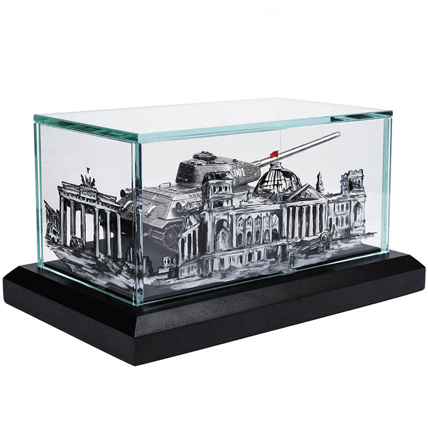 Ручка поставляется в уникальной упаковке: танк установлен на деревянный постамент под стеклянным куполом. На внутренней стороне купола — художественная роспись по архивной фотографии Евгения Халдея, изображающей советских солдат на Т-34-85 у Бранденбургских ворот в мае 1945 года. Роспись выполнена акрилом, добавляя исторической атмосферы.