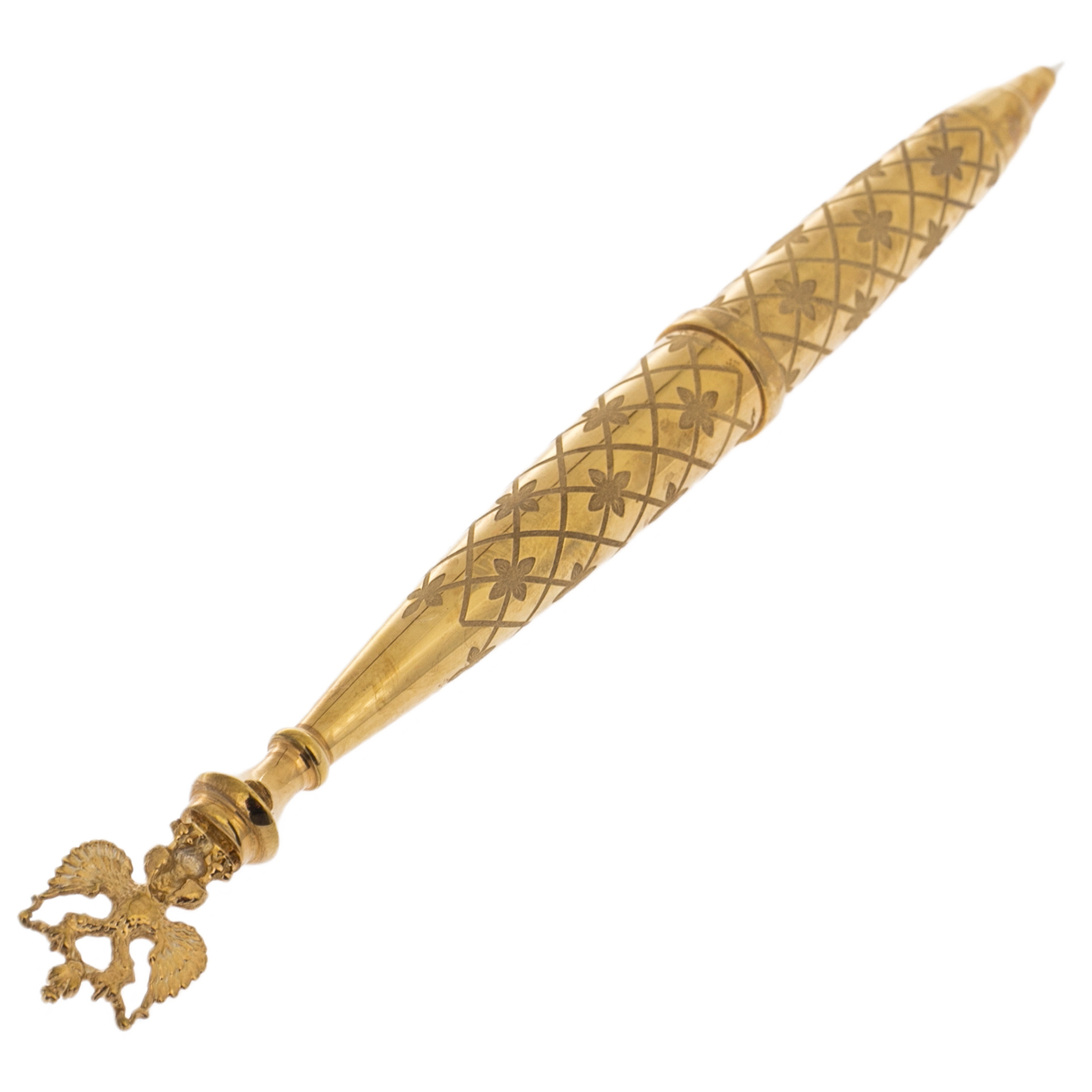 Тело ручки, покрытое благородным золотом, словно облекает письменный инструмент в доспехи триумфатора. Геометрический узор, играющий на поверхности, напоминает о величии замков и дворцов, где решения монархов меняли ход истории. Верхушку украшает двуглавый орёл — государственный герб, символ мудрости и решительности, способный направлять взоры одновременно на прошлое и будущее.
