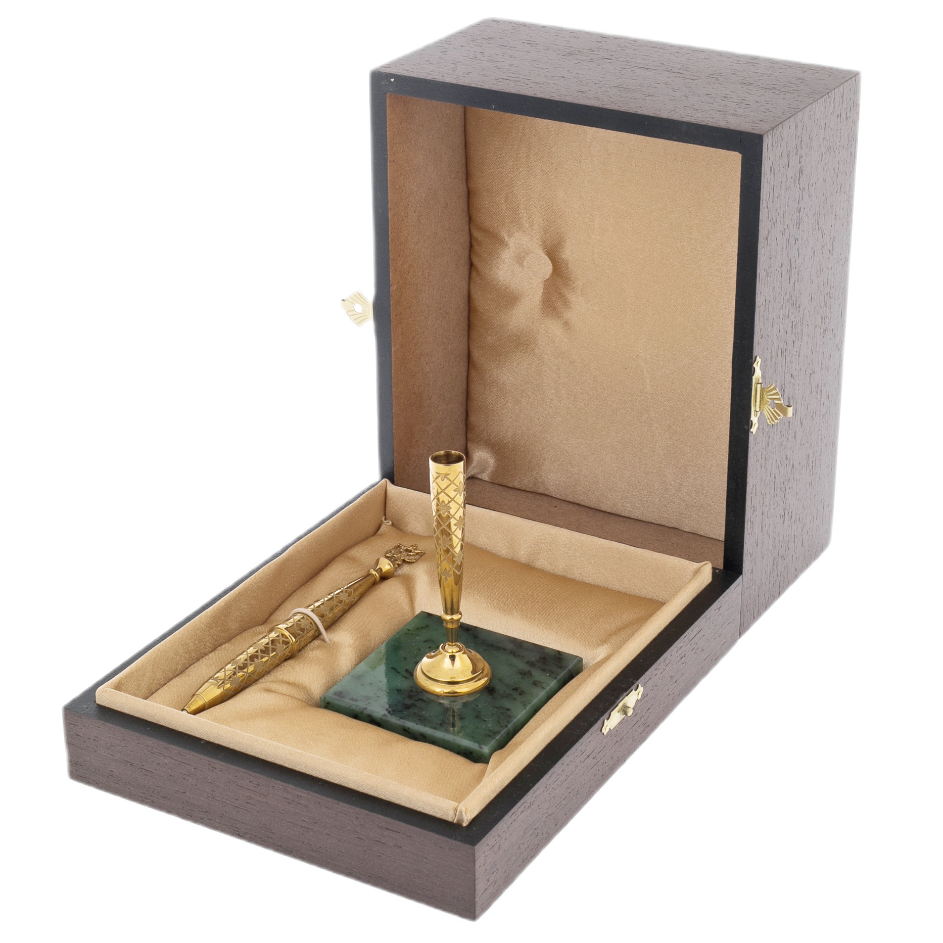 Золотая ручка на нефритовой подставке — это не просто письменный аксессуар, но воплощение амбиций, торжества статуса и стремления к вершинам. Каждый элемент этой композиции — гимн роскоши и власти, слияние традиций ювелирного мастерства и символики величия.