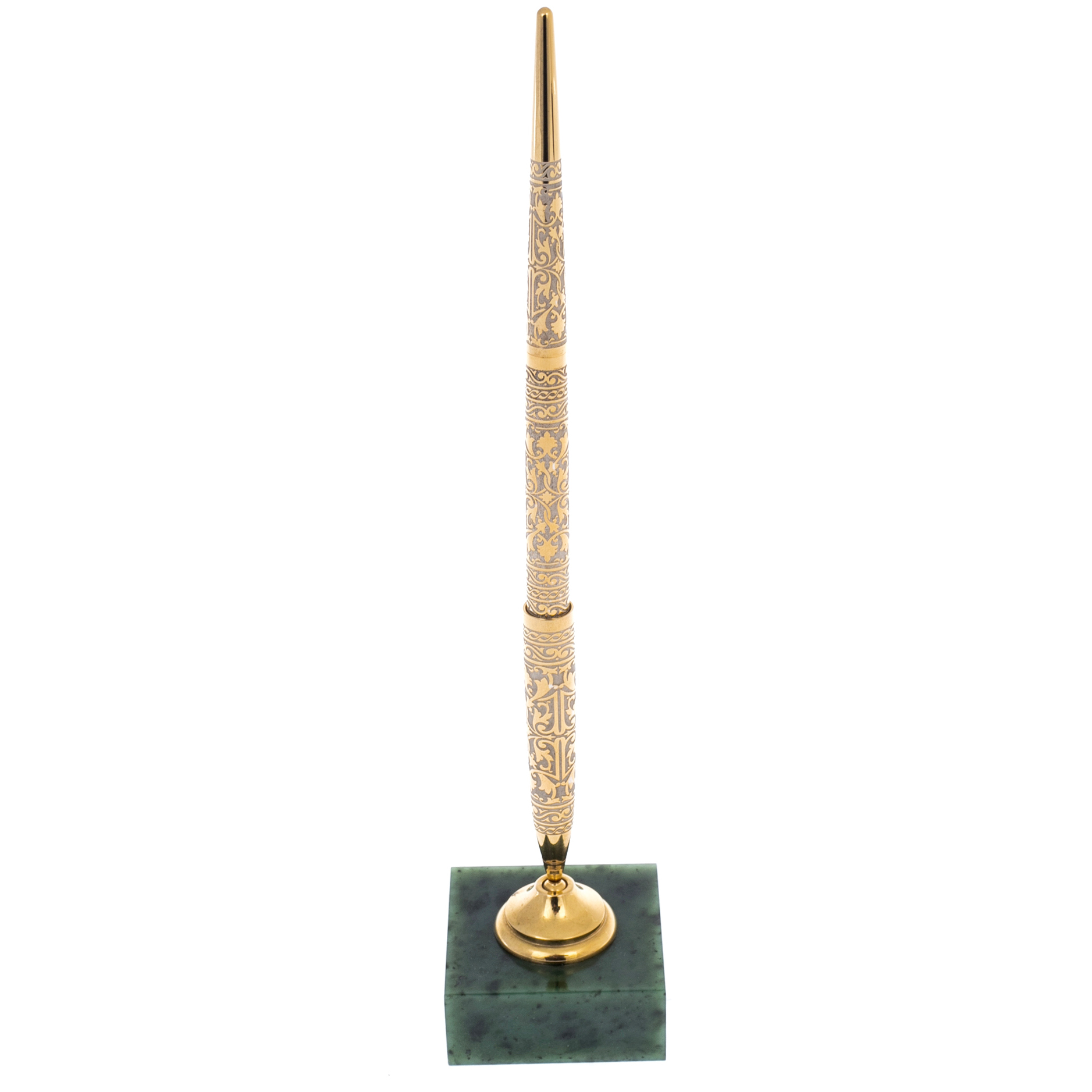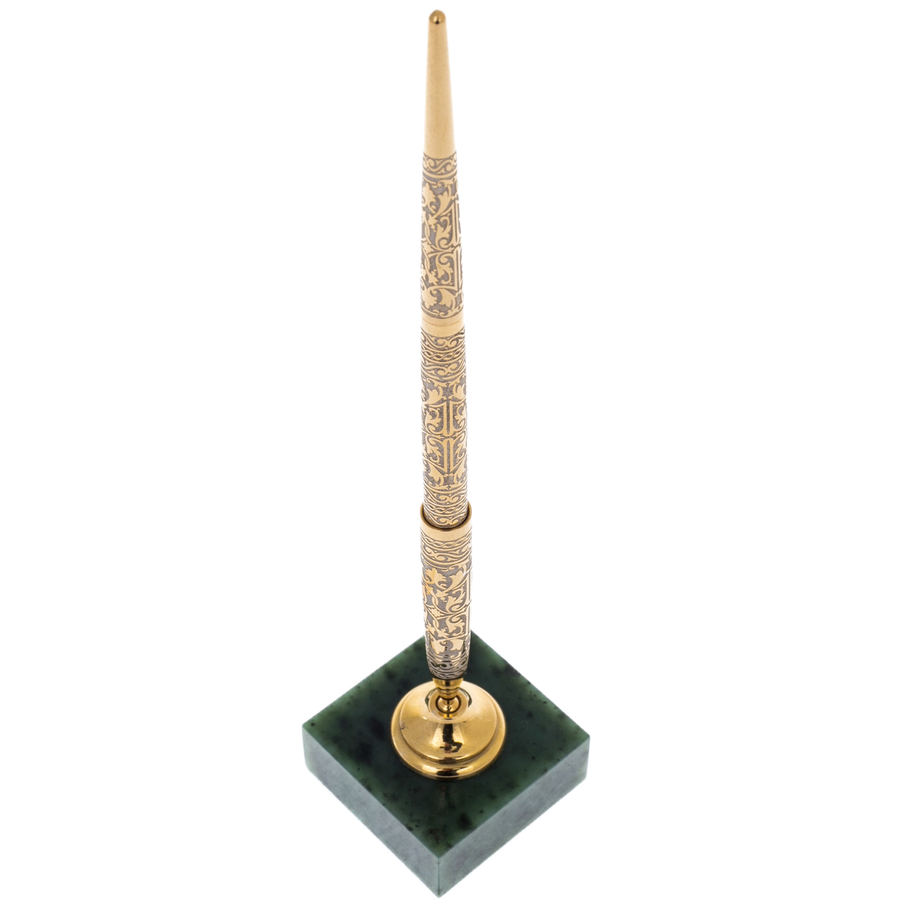 Ручка на нефритовой подставке «Статус», Златоуст — кабинетный предмет, созданный для тех, кто привык фиксировать решения красиво и без суеты. Строгий вертикальный силуэт держателя поднимает ручку над плоскостью стола, превращая её в заметный акцент делового пространства. Основание выполнено из полированного нефрита глубокого зелёного тона с естественными вкраплениями и мягкими переходами оттенков, сверху — компактная опора с тёплым золотистым блеском. Сам корпус вытянутый, тонкий, с благородным сочетанием светлого металла и позолоченных деталей, удобно ложится в руку, подойдёт руководителю, владельцу бизнеса, юристу, финансисту — всем, кому важны не только слова, но и впечатление, остающееся после подписи.