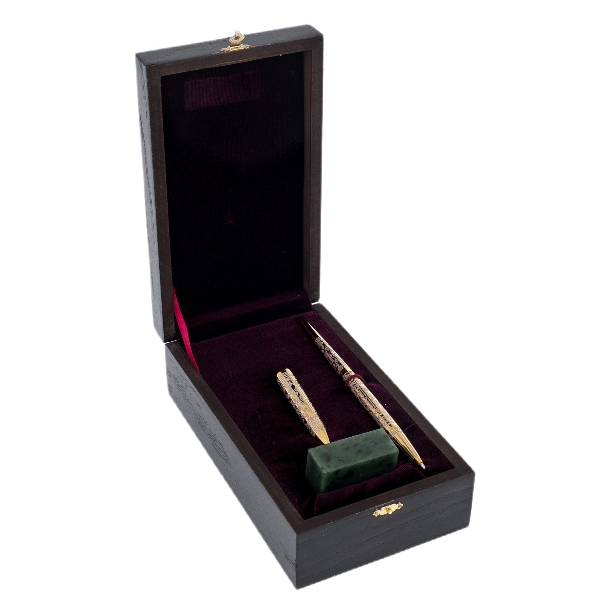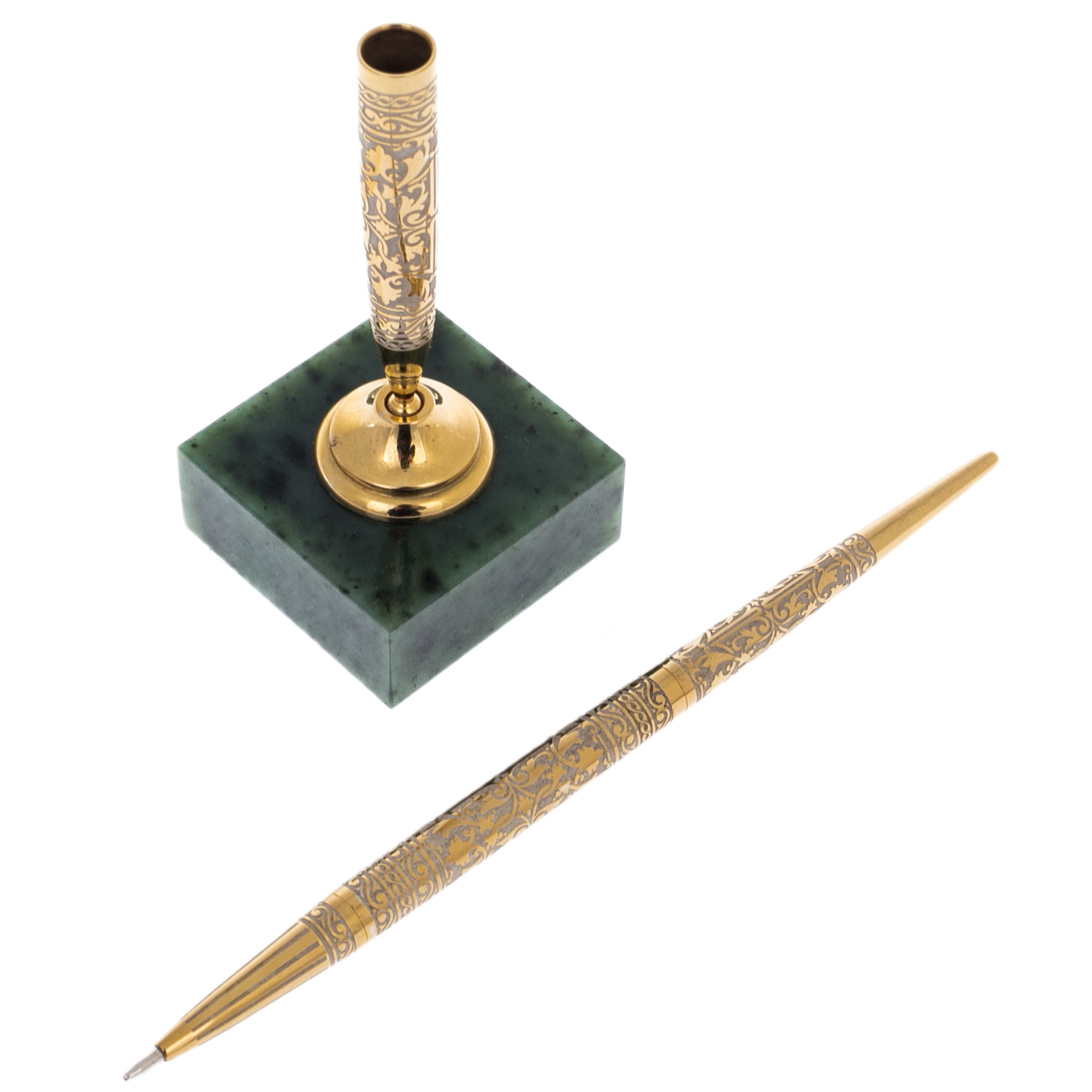 В «Статусе» особенно убедительно звучит сочетание материалов: камень дарит ощущение устойчивости, металл — ясность и собранность, орнамент — интеллектуальную роскошь без лишней демонстративности. Нефритовый куб воспринимается как «фундамент» — спокойный, тяжёлый, уверенный, а золотистая опора и изящная вязь узора добавляют торжественности, уместной и в личном кабинете, и в переговорной. Такой аксессуар хорошо ложится в протокольный подарок и в персональную благодарность: вещь говорит за владельца тихо, но убедительно, оставляя впечатление вкуса, меры и внутренней силы.