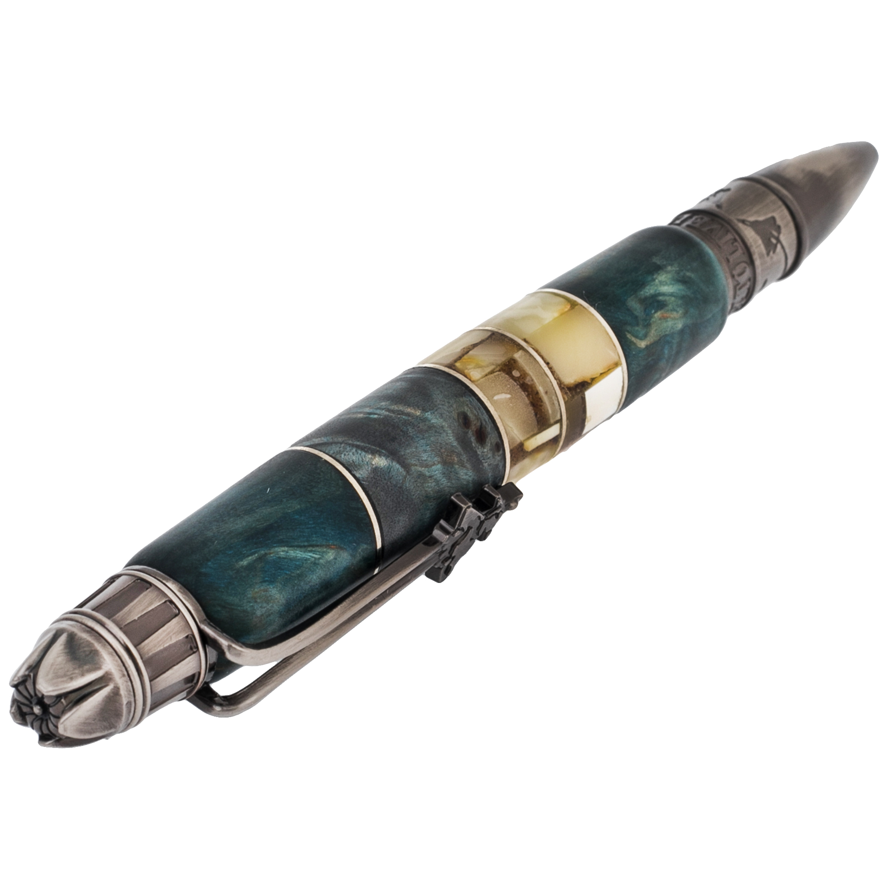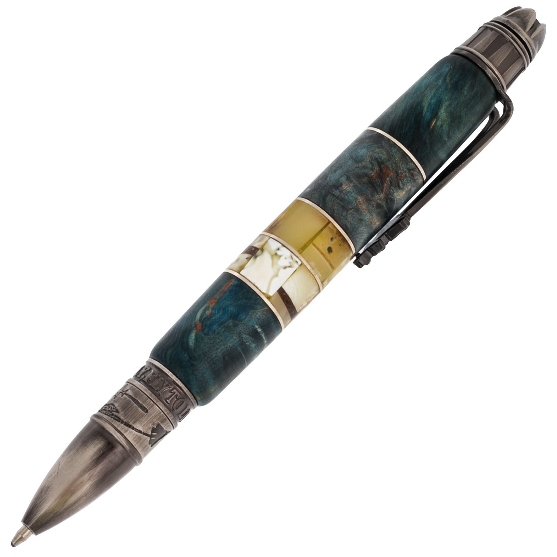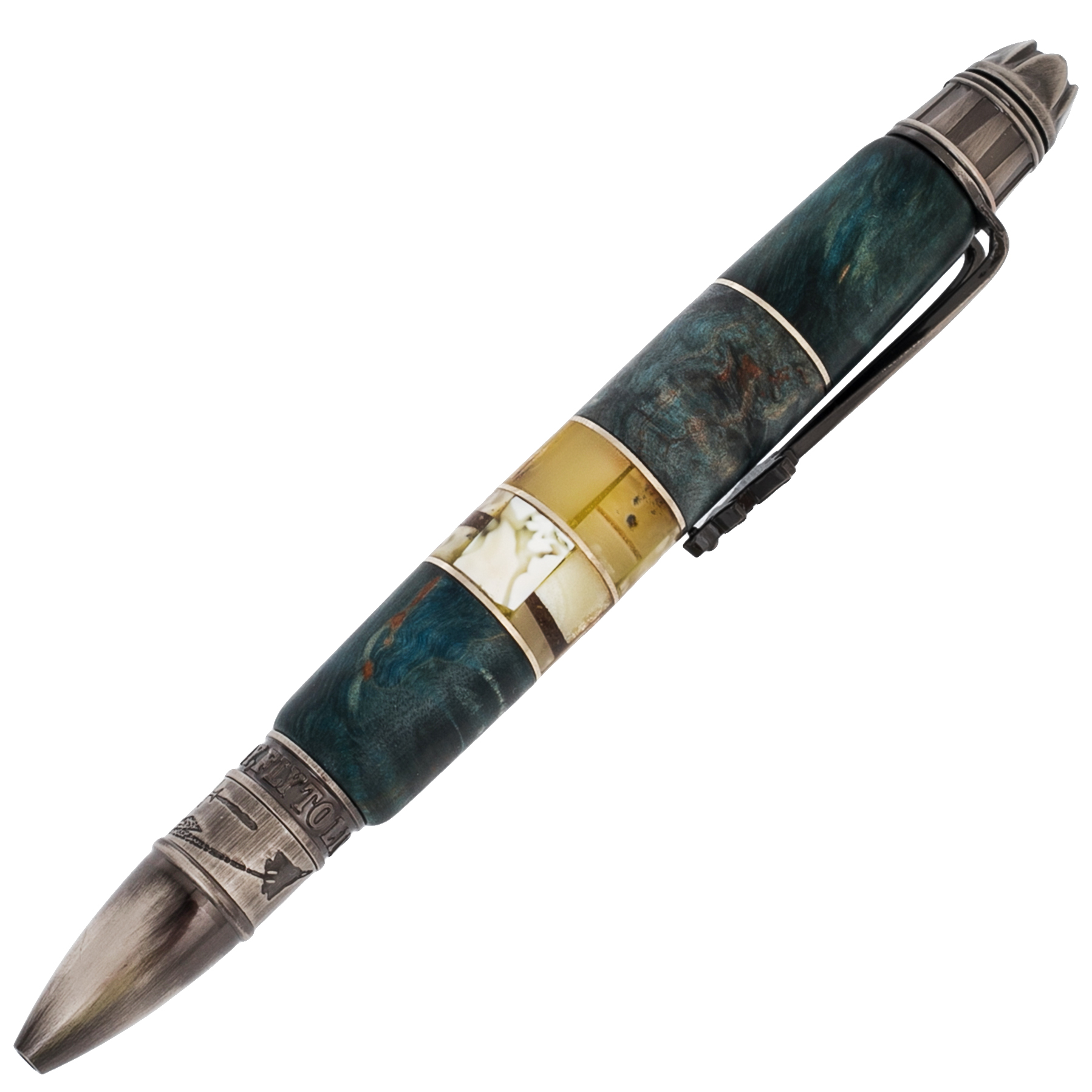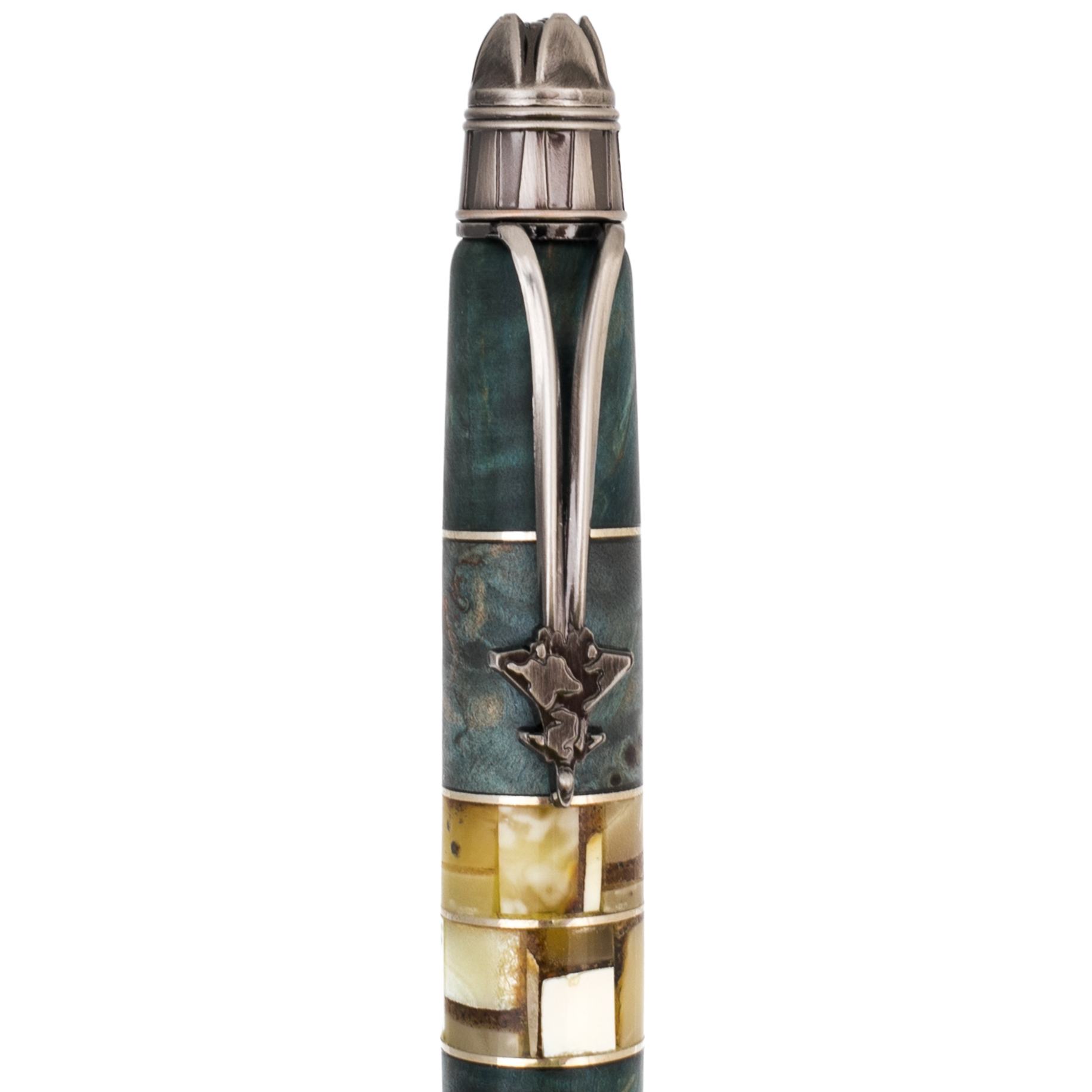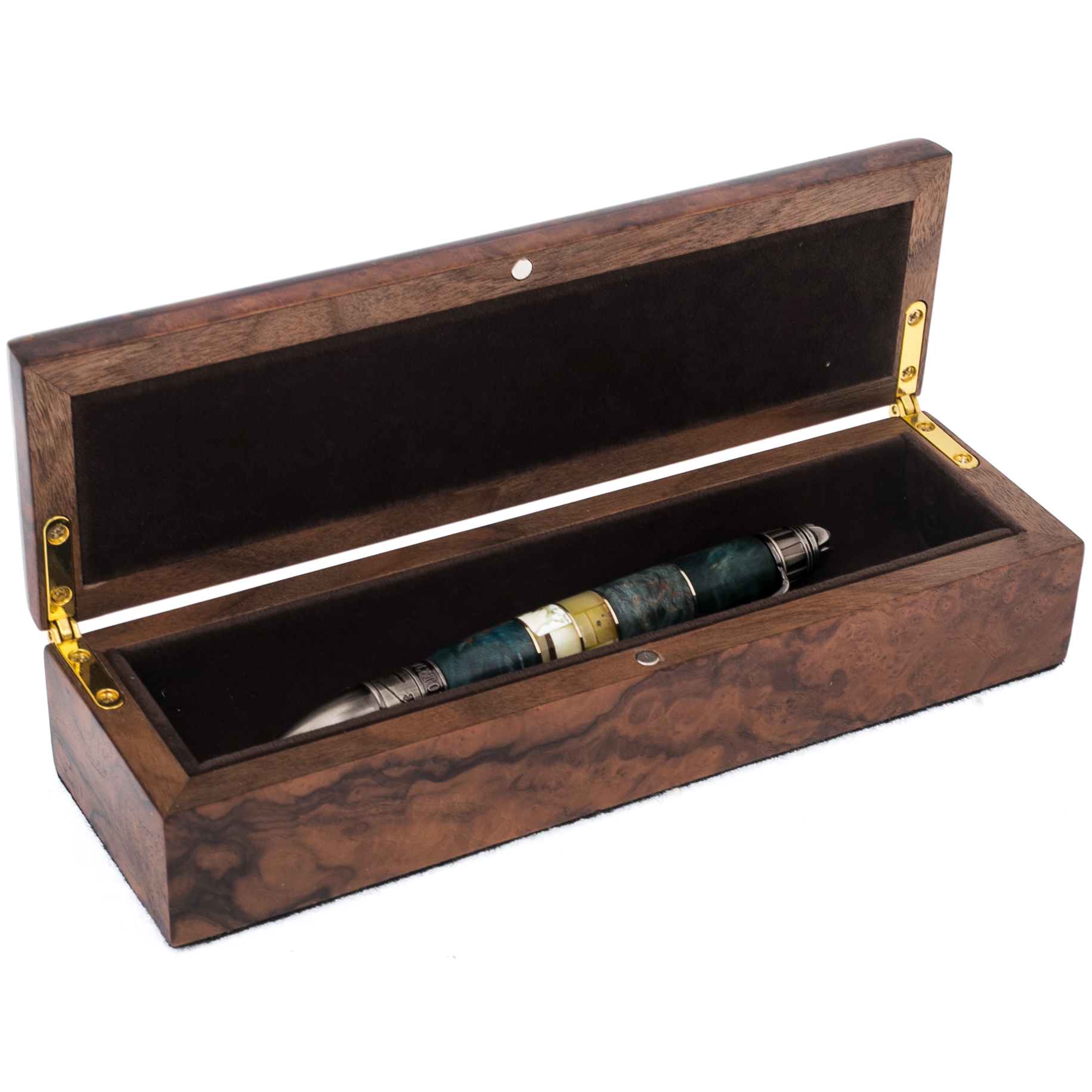 Корень ореха известен своим характером: неоднородной структурой, игрой светотени, глубиной цвета. Это материал с историей, срез времени, застывший в древесине. Металлические элементы, оформленные гравировкой, рельефом или патиной, добавляют ручке образ надёжности и силы — как в характере у тех, кто выбирает по-настоящему редкие вещи.
