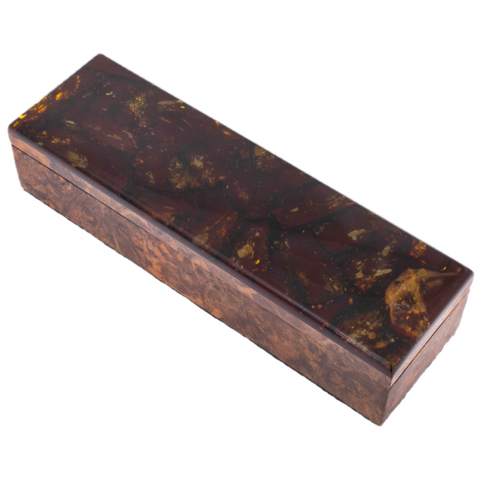 Подарочная шкатулка, изготовленная из дерева и украшенная янтарём, дополняет впечатление. Тёплый блеск камня и благородная текстура дерева делают упаковку самостоятельным предметом интерьера. Такой набор станет достойным подарком для коллекционера, руководителя, ценителя письменных принадлежностей или человека, склонного к изысканным символам власти и стиля.