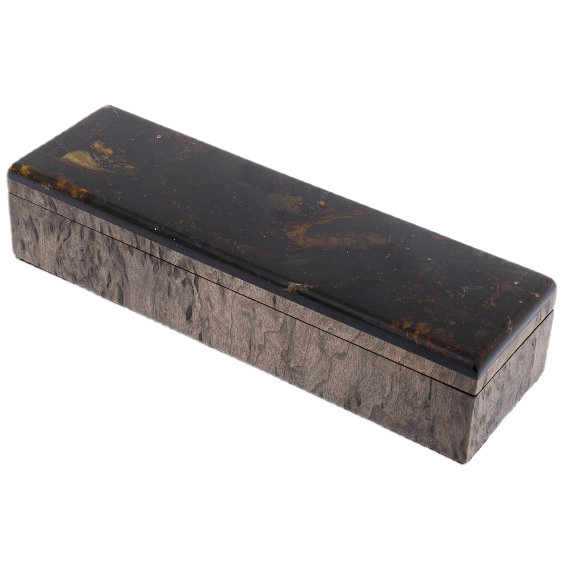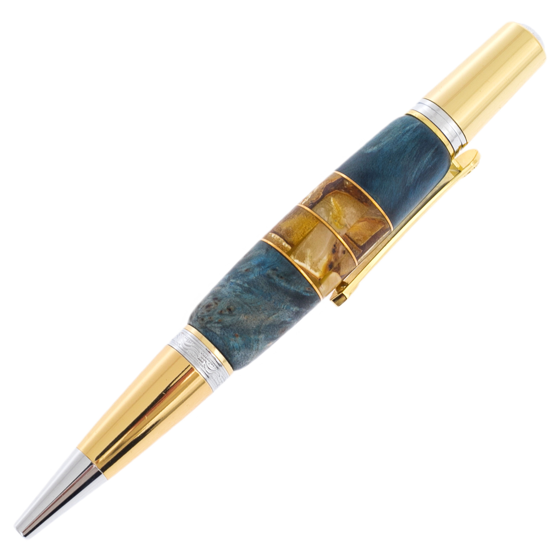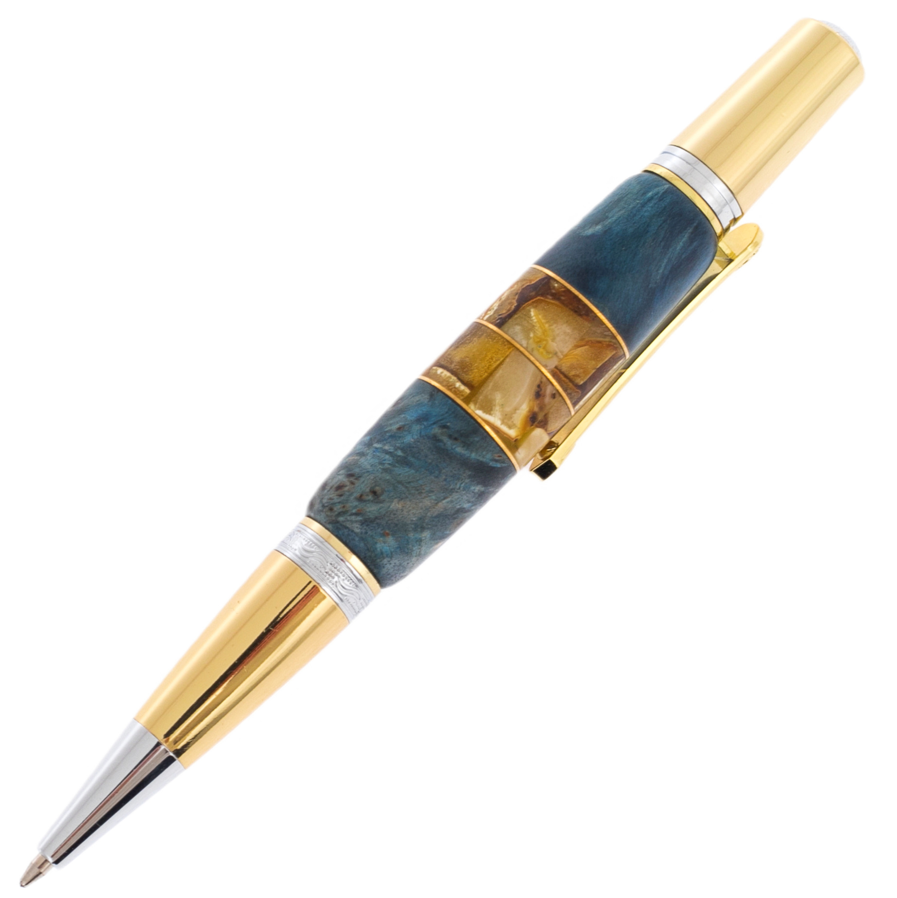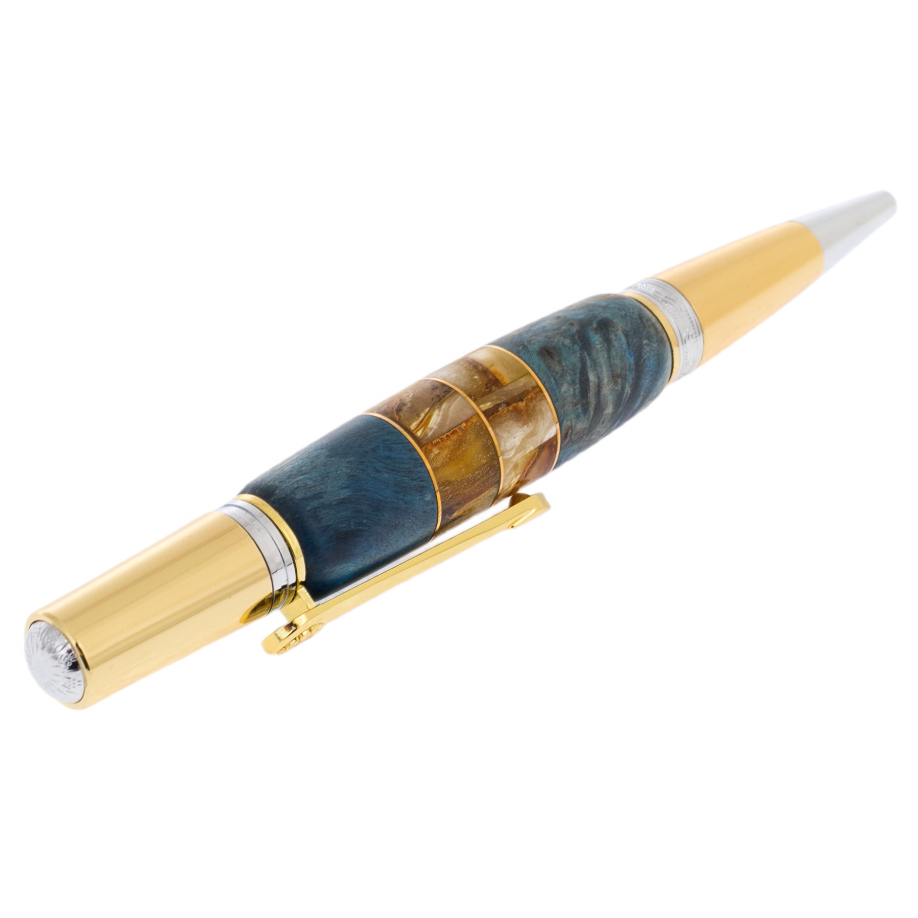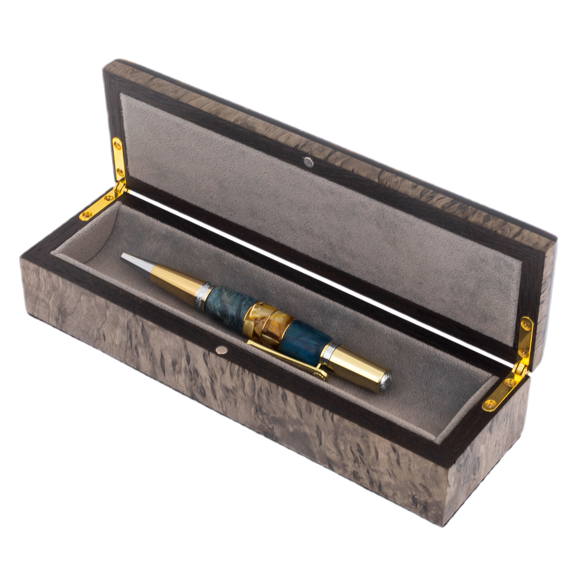 Ручка шариковая из карельской березы и янтаря "Цветок" голубая, в футляре