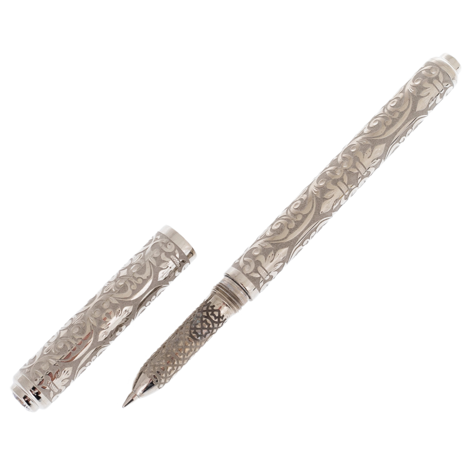 Корпус ручки щедро украшен гравировкой с растительными мотивами, плавные линии которых переливаются в свете, создавая ощущение многослойности и глубины. Каждый завиток узора словно ткет нить истории, связывая современность с традициями древнего искусства мастеров Златоуста. Серебристый блеск поверхности не только отражает великолепие металлической обработки, но и вызывает ассоциации с холодным оружием, символом силы и победы.