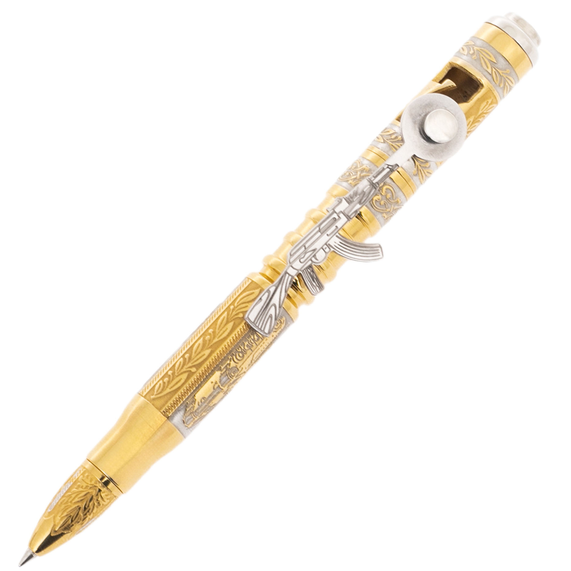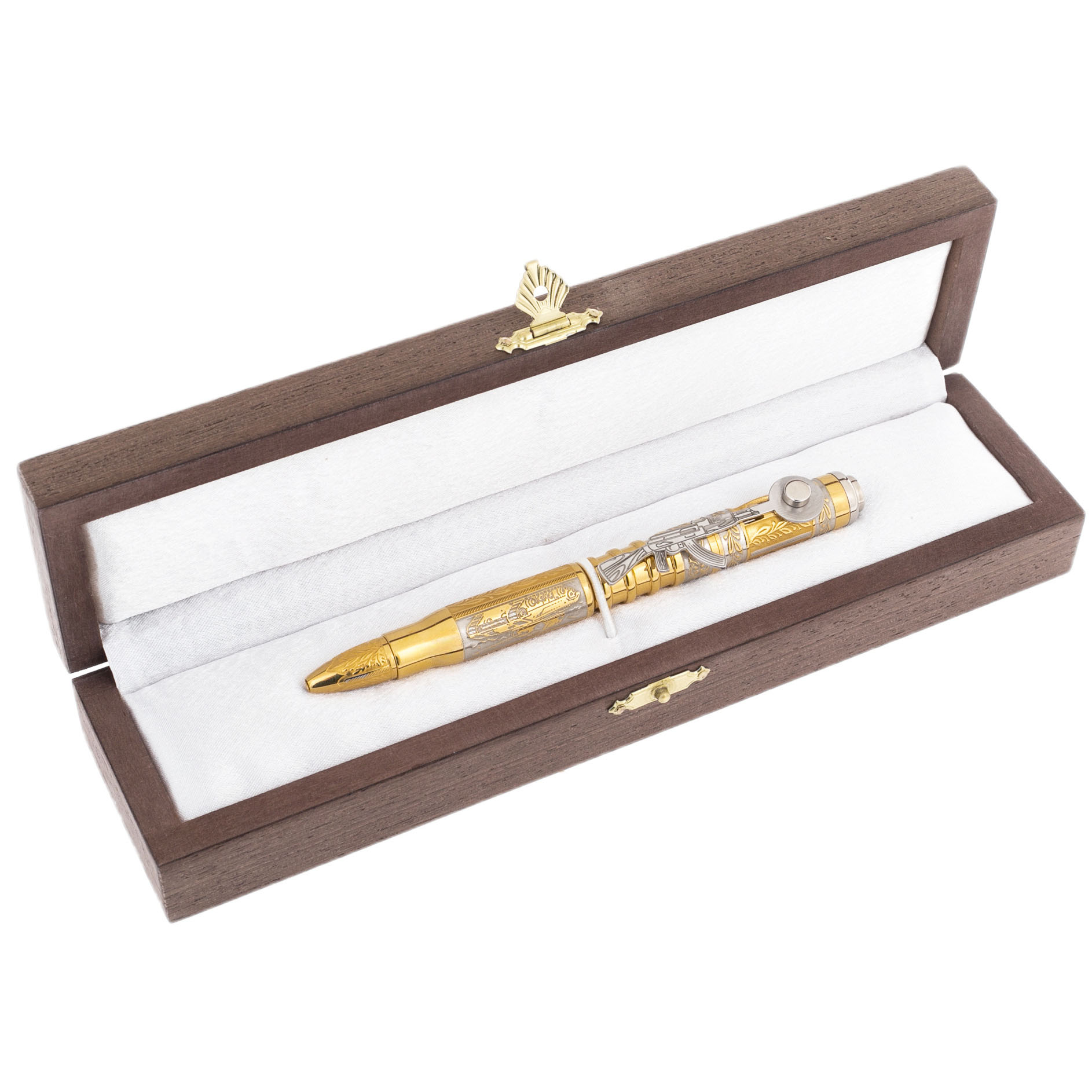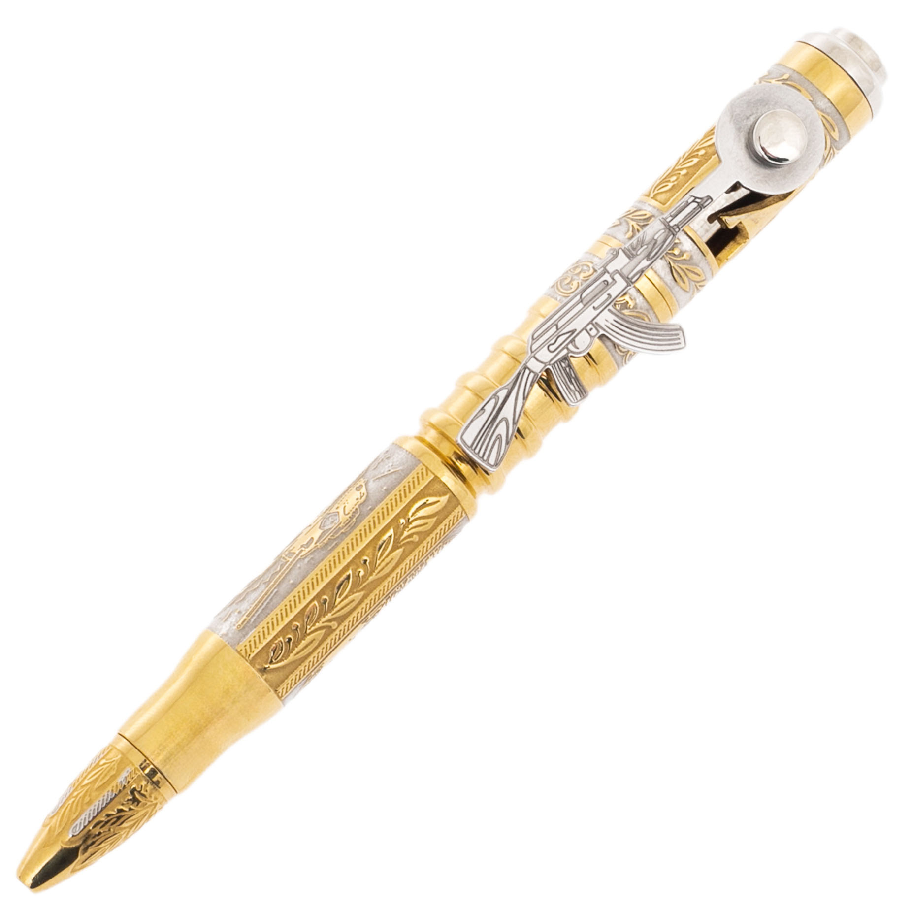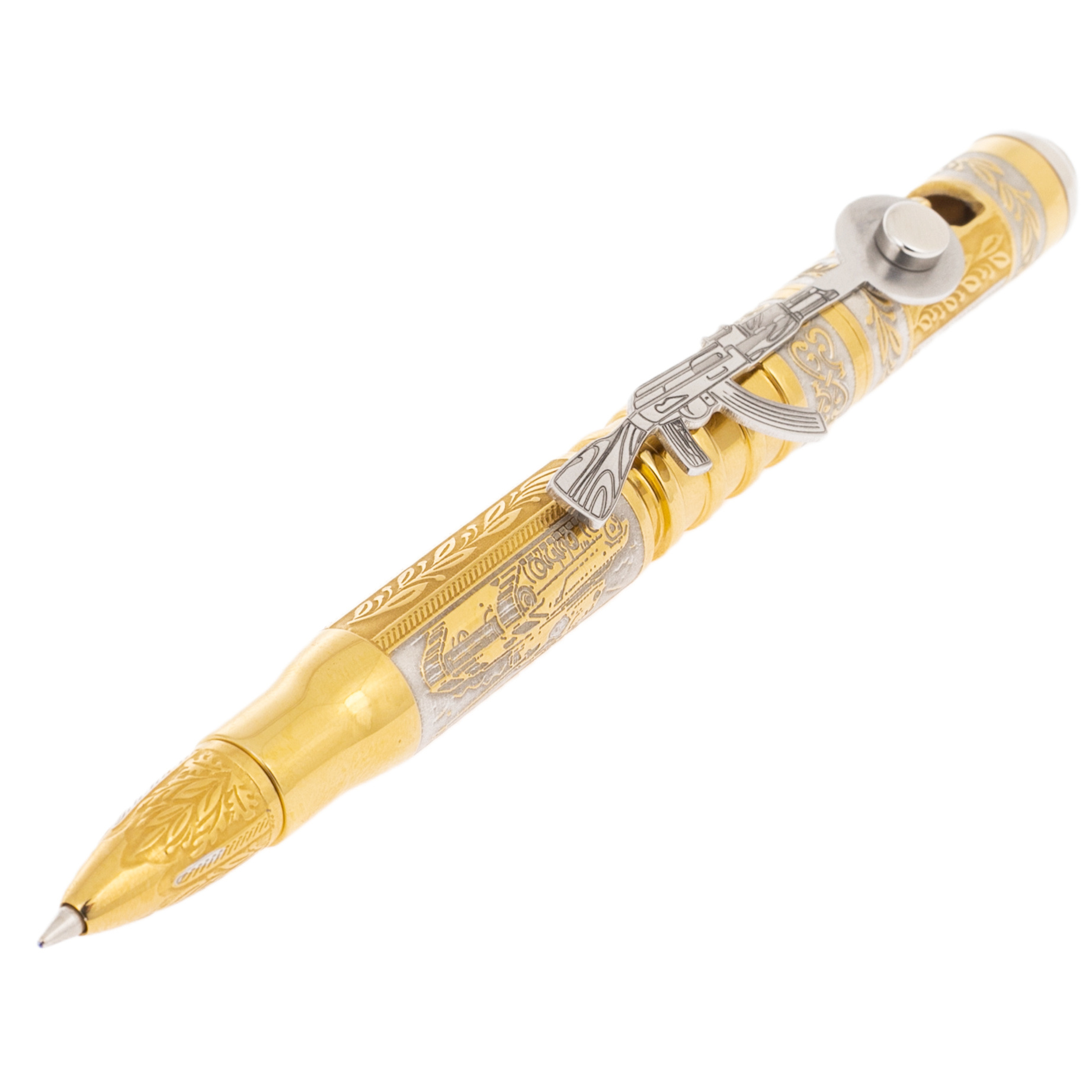 Подарочная ручка «Танк» — произведение оружейного искусства, сочетающее в себе блеск драгоценных металлов и символику воинской доблести. Массивный корпус, отлитый из латуни и украшенный филигранной гравировкой, покрыт слоем золота и никеля, создающим выразительный контраст между светлым и тёплым металлом. Центральный элемент дизайна — миниатюрная модель автомата Калашникова, отлитая вручную и установленная на клипсу, подчёркивает боевой дух и непреклонный характер владельца.