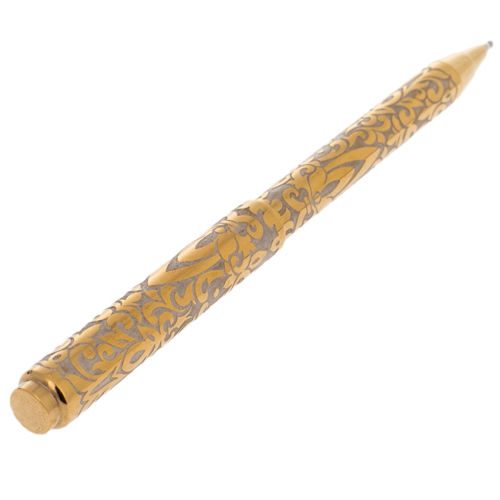 Златоустовская техника украшения металла, возникшая ещё в XIX веке, требует филигранной точности и абсолютного чувства меры. На поверхность наносится рисунок, затем отдельные участки шлифуются и покрываются золотом методом горячего травления. Этот процесс превращает простую деловую принадлежность в произведение декоративно-прикладного искусства. Каждая деталь продумана: плавный баланс корпуса, удобный вес, мягкость хода — всё подчинено идее безупречного комфорта и долговечности.