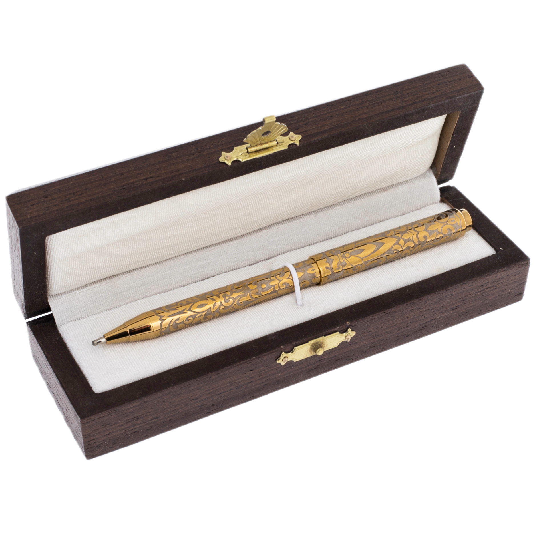 Ручка украшенная «Стандарт», Златоуст — классический образец делового стиля, воплощённый в драгоценных материалах и филигранной технике исполнения. Её корпус выполнен из латуни с никелевым основанием и покрыт густым слоем золочения, подчёркивающим мягкий блеск и изысканность форм. Поверхность украшена традиционным златоустовским гравированием — узором из изящных завитков и растительных орнаментов, исполненных вручную. Мастер тщательно прорисовывает каждый элемент, добиваясь гармонии между строгой геометрией и плавностью линий, благодаря чему предмет приобретает ювелирный характер.
