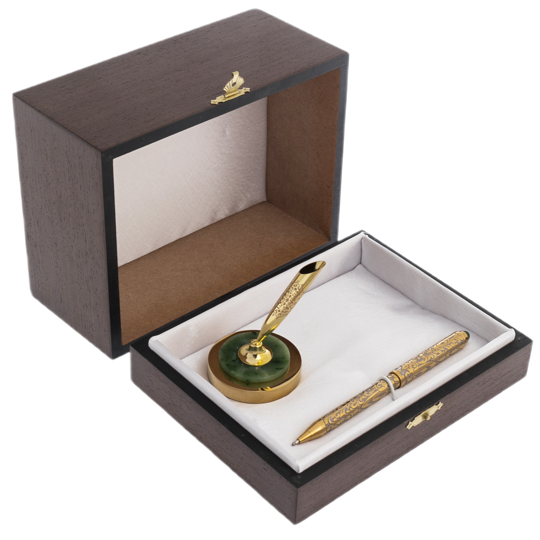 Подставка из нефрита — камня, почитаемого за его силу и энергию, — служит основой, способной подчеркнуть значение каждого документа, подписанного этим инструментом. Её зелёный оттенок — это цвет спокойствия и власти, которая не кричит, а просто присутствует, заставляя мир склониться в уважении. Массивность нефрита создает контраст с утончённой линией ручки, показывая, что истинная сила всегда требует баланса.