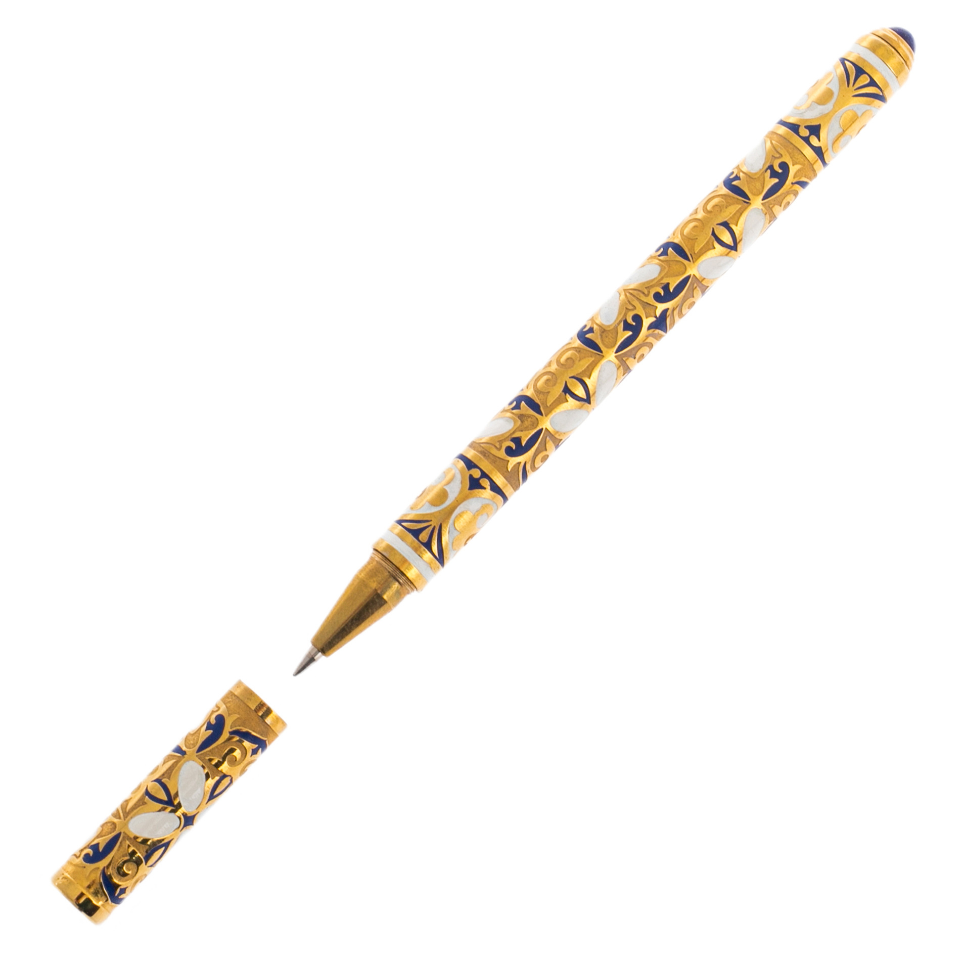 Корпус, покрытый золотым сиянием, украшают витиеватые узоры, напоминающие орнаменты древних рукописей, в которых заключены тайны веков. Каждый завиток на поверхности словно оживает, создавая ощущение бесконечного движения — игры света и тени, переплетения власти и элегантности. Глубокие синие акценты подчеркивают торжественность формы, добавляя ей благородства и величия.