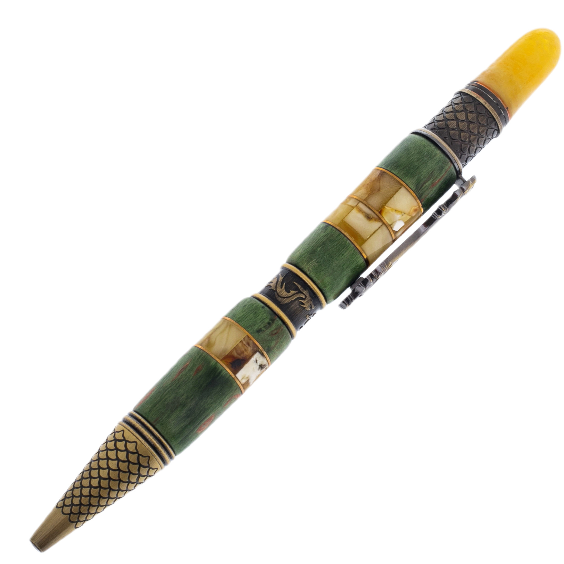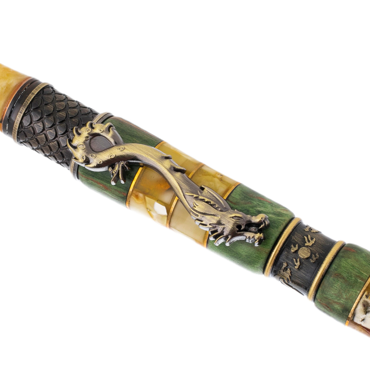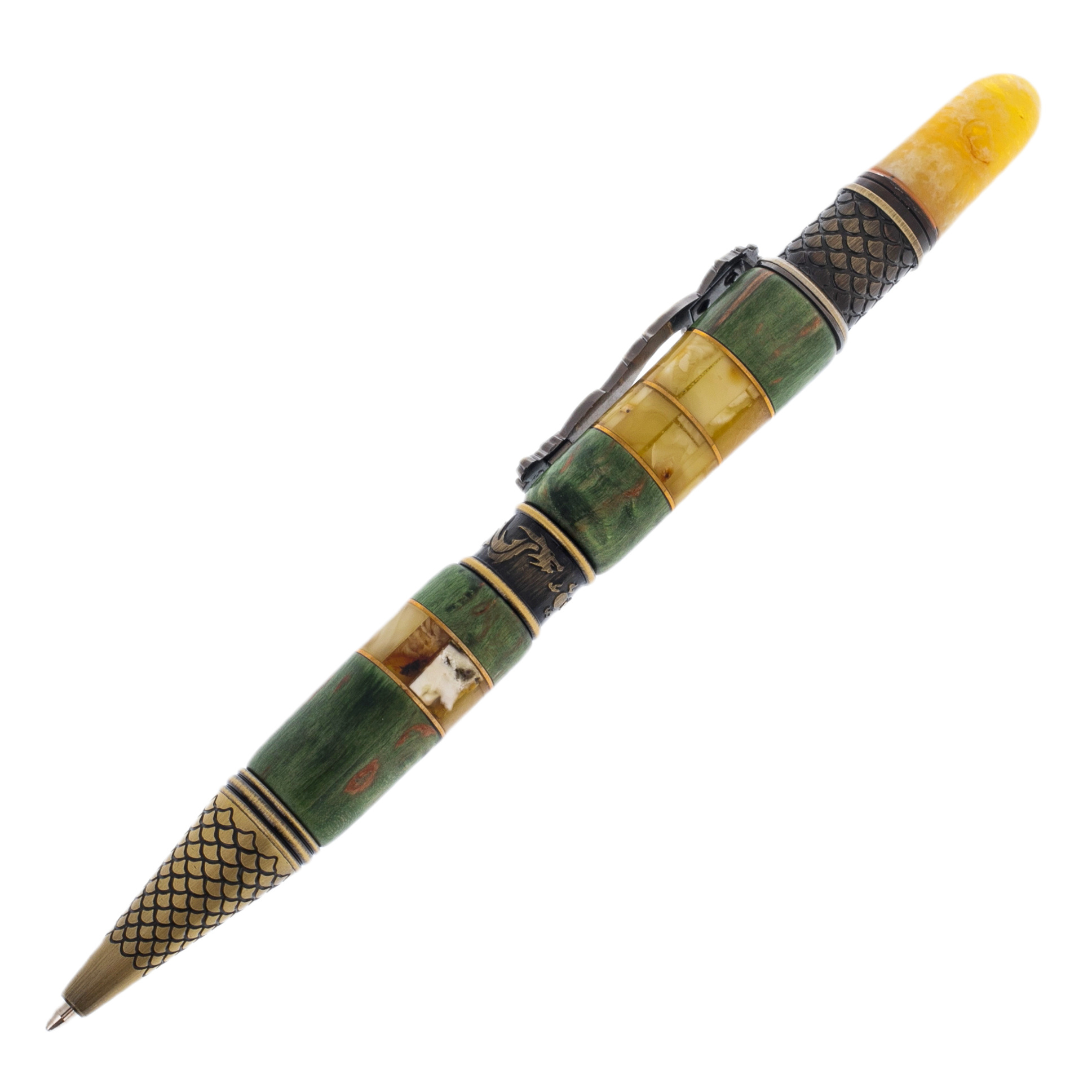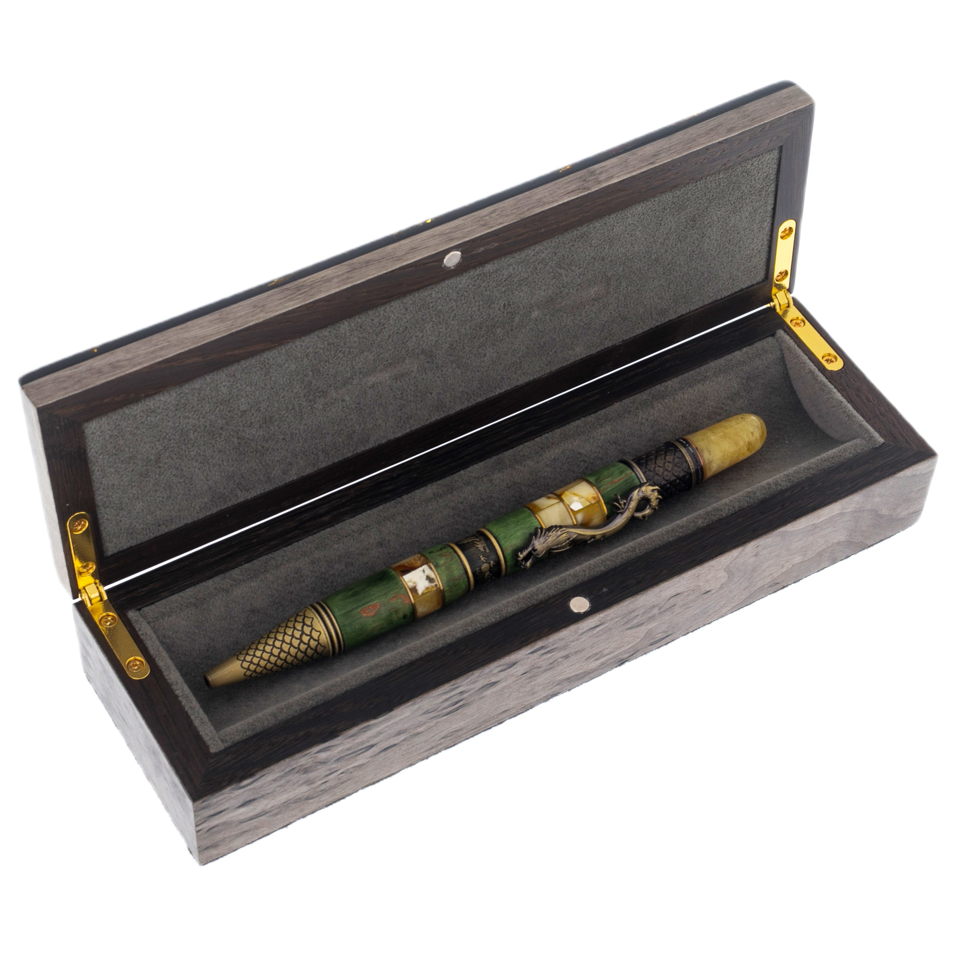 Шариковая ручка из карельской березы и янтаря "Дракон" в футляре, зеленая