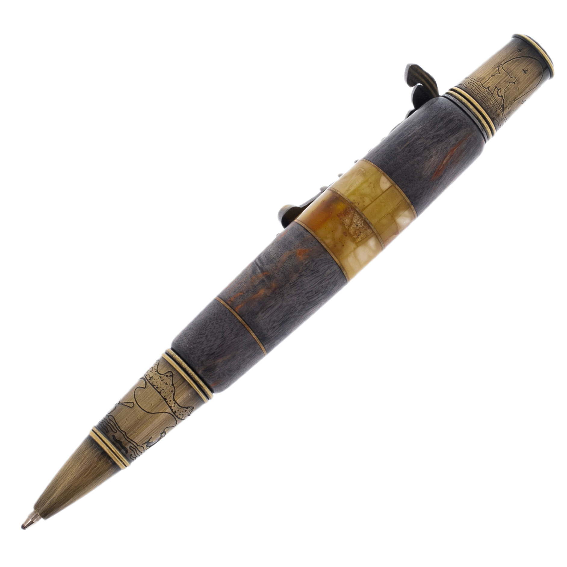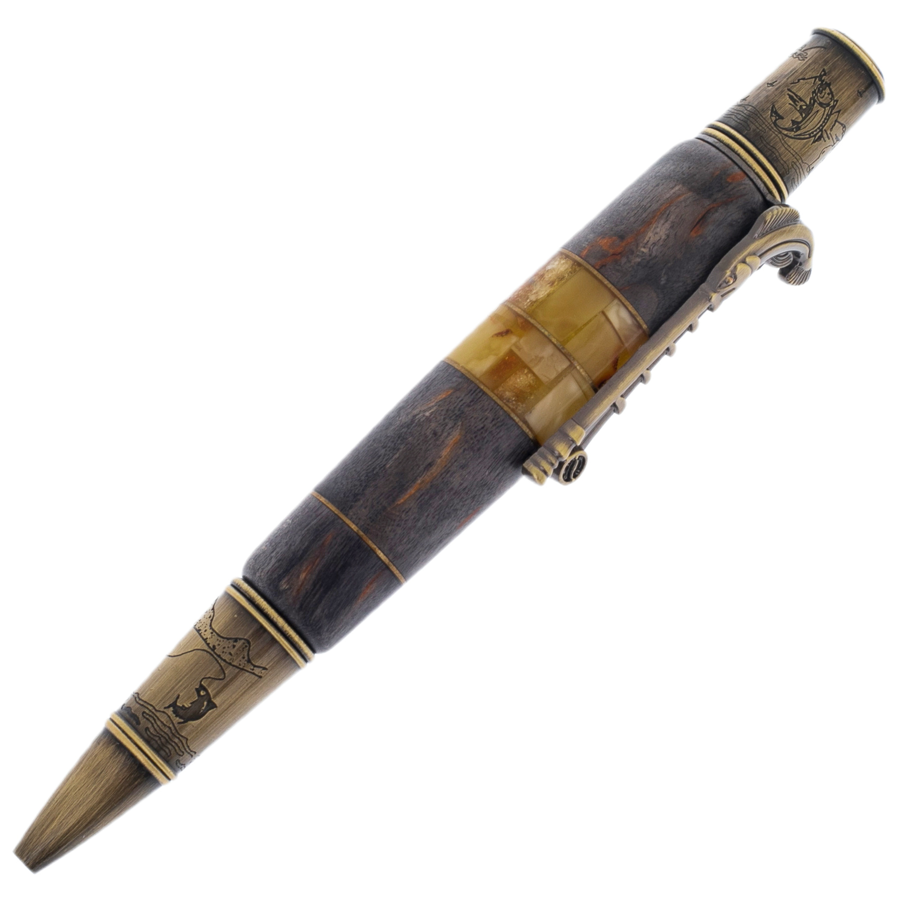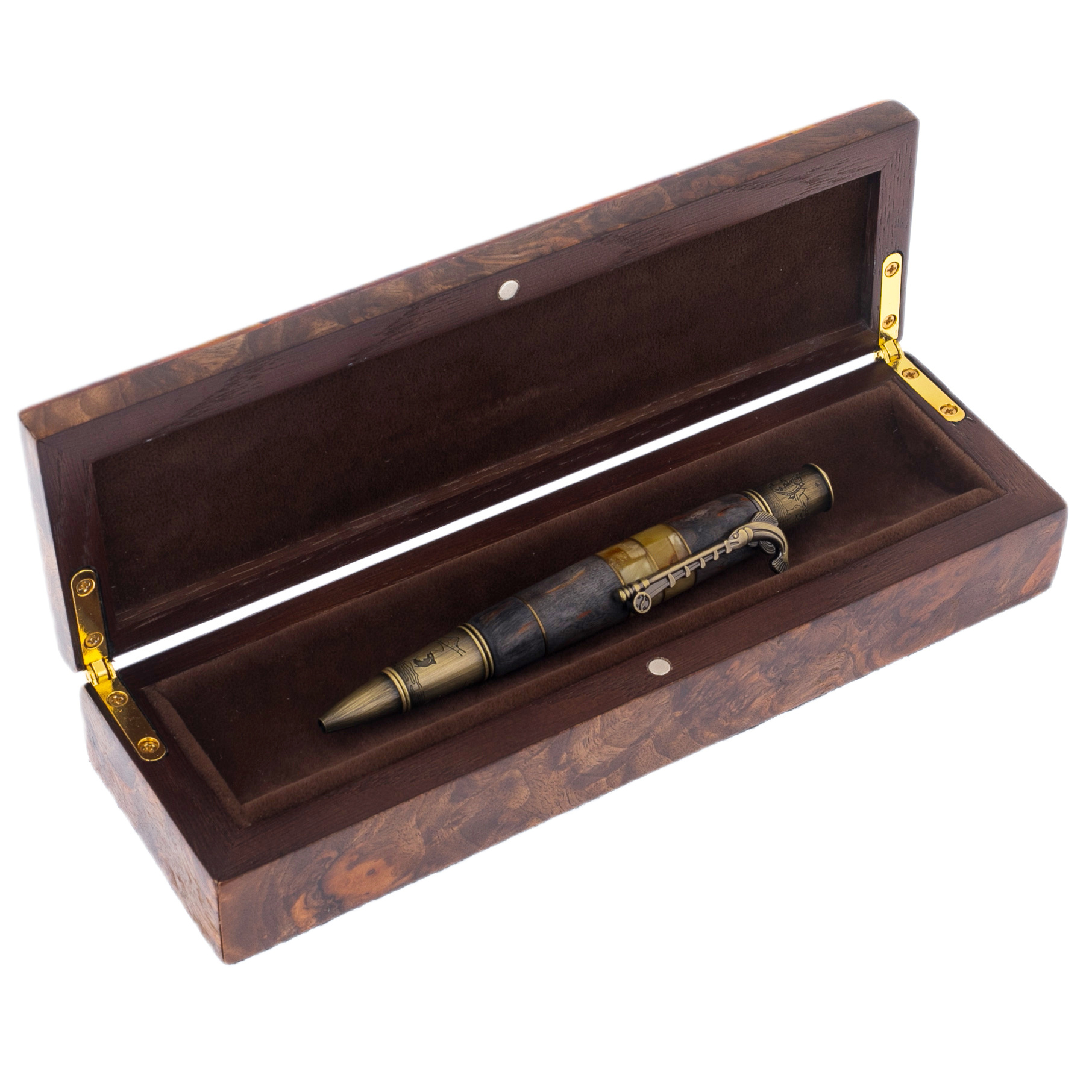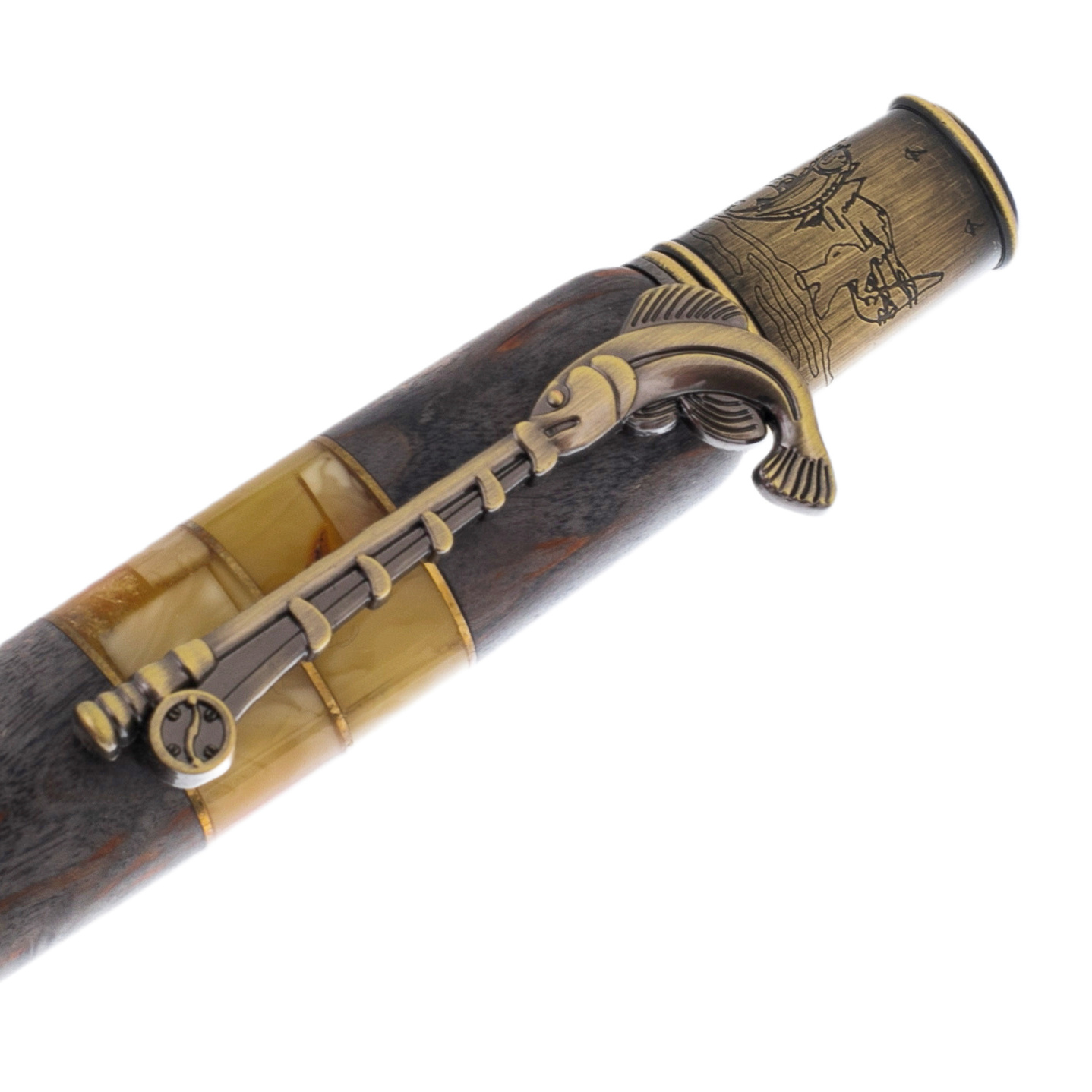 Шариковая ручка из корня ореха и янтаря "Рыбалка" в футляре, серая