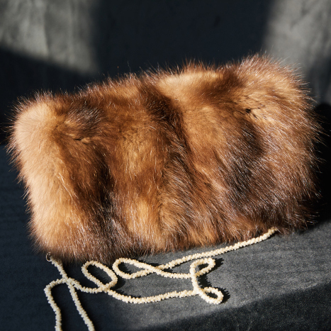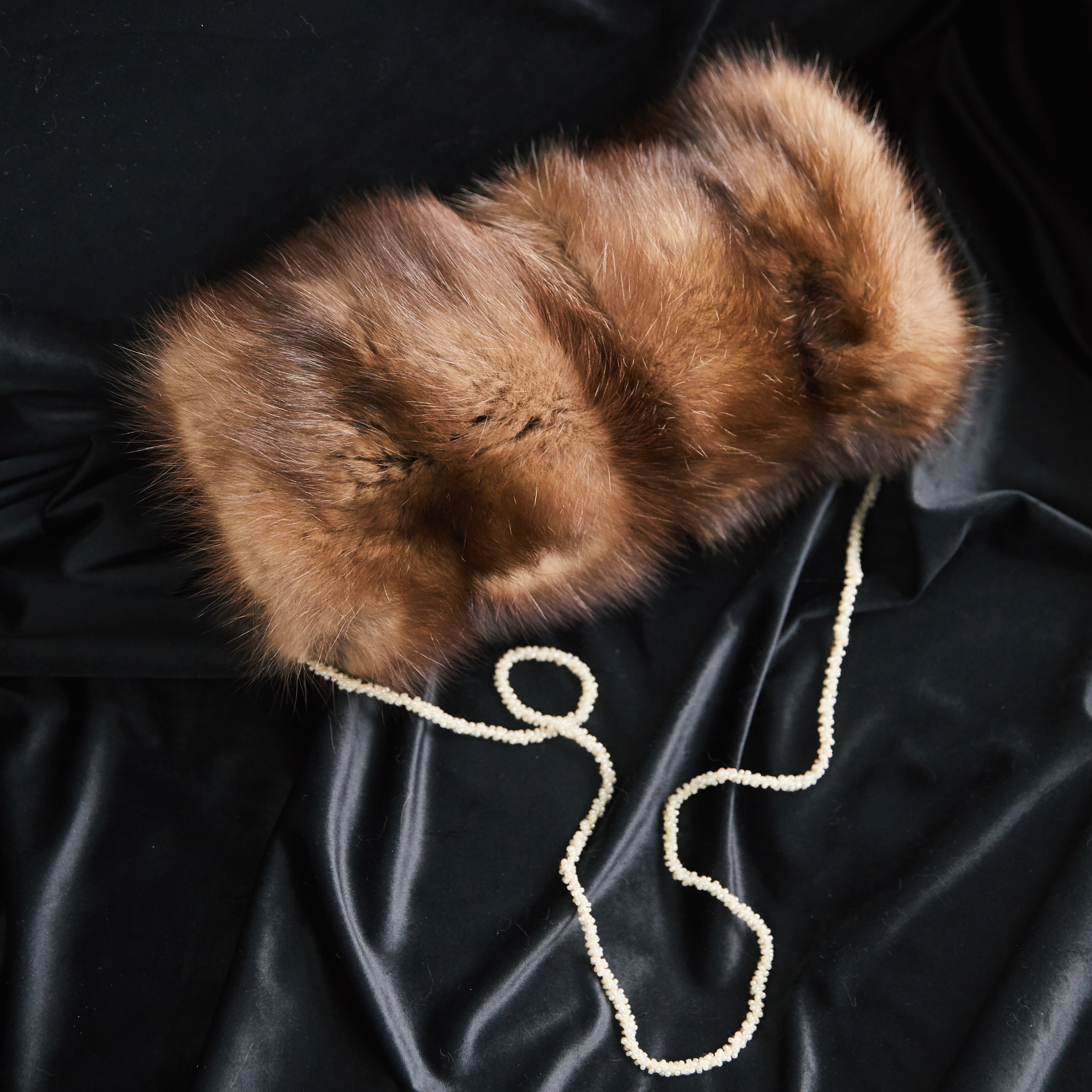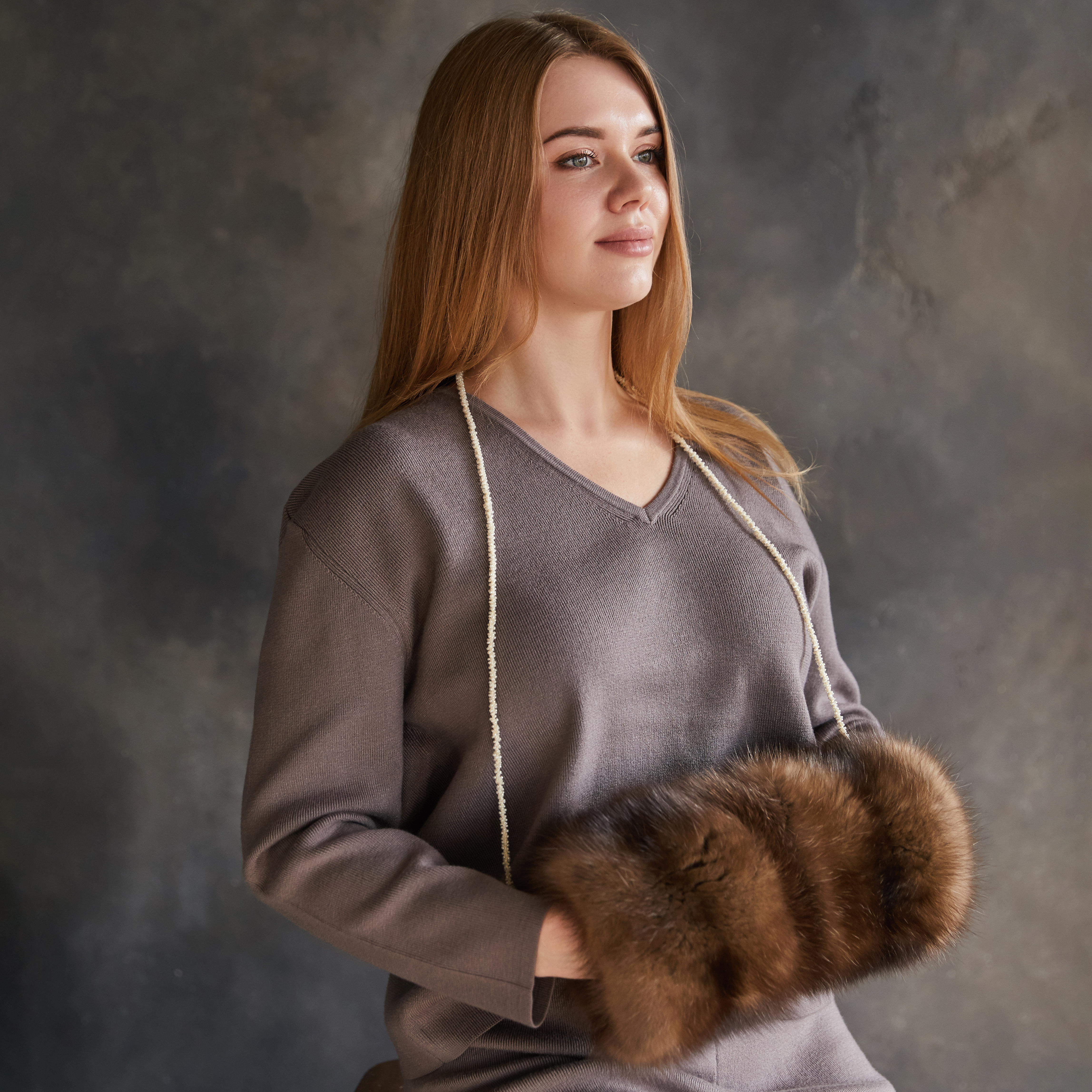 Богатый коричнево-золотистый оттенок меха переливается при каждом движении, словно мерцающие огоньки свечей в старинных дворцовых залах. Природный узор меха — шедевр, созданный временем и северной стужей, превращается в драгоценную картину, достойную восхищения. Белоснежная подвеска из жемчужного шнура — акцент, подобный тонкому росчерку пера великого художника, завершающему произведение искусства. Она словно мостик между современным миром и эпохой, когда элегантность являлась мерилом величия.