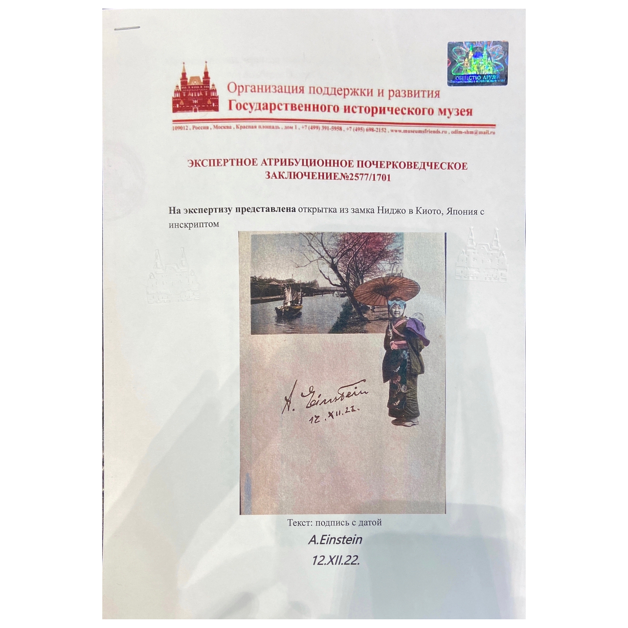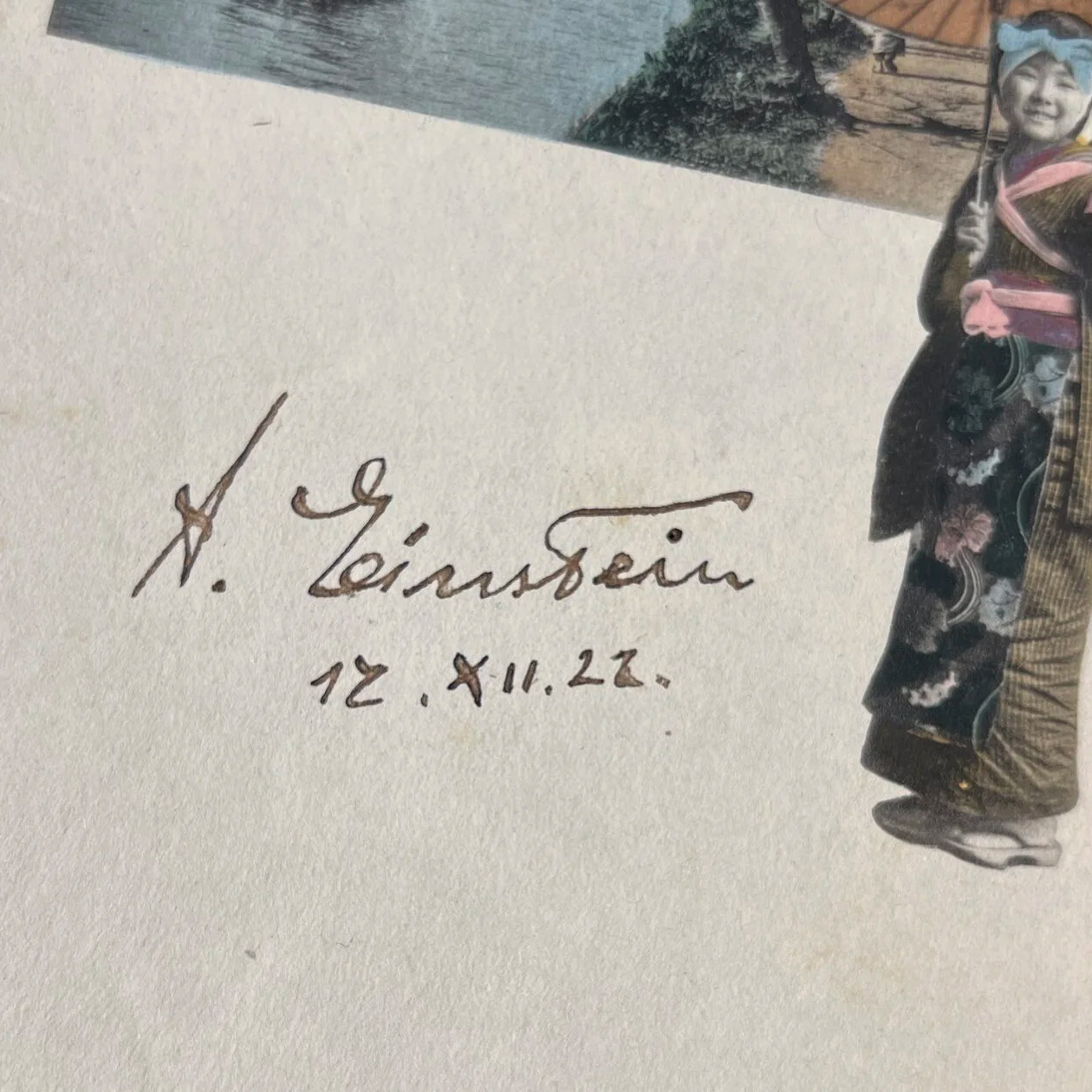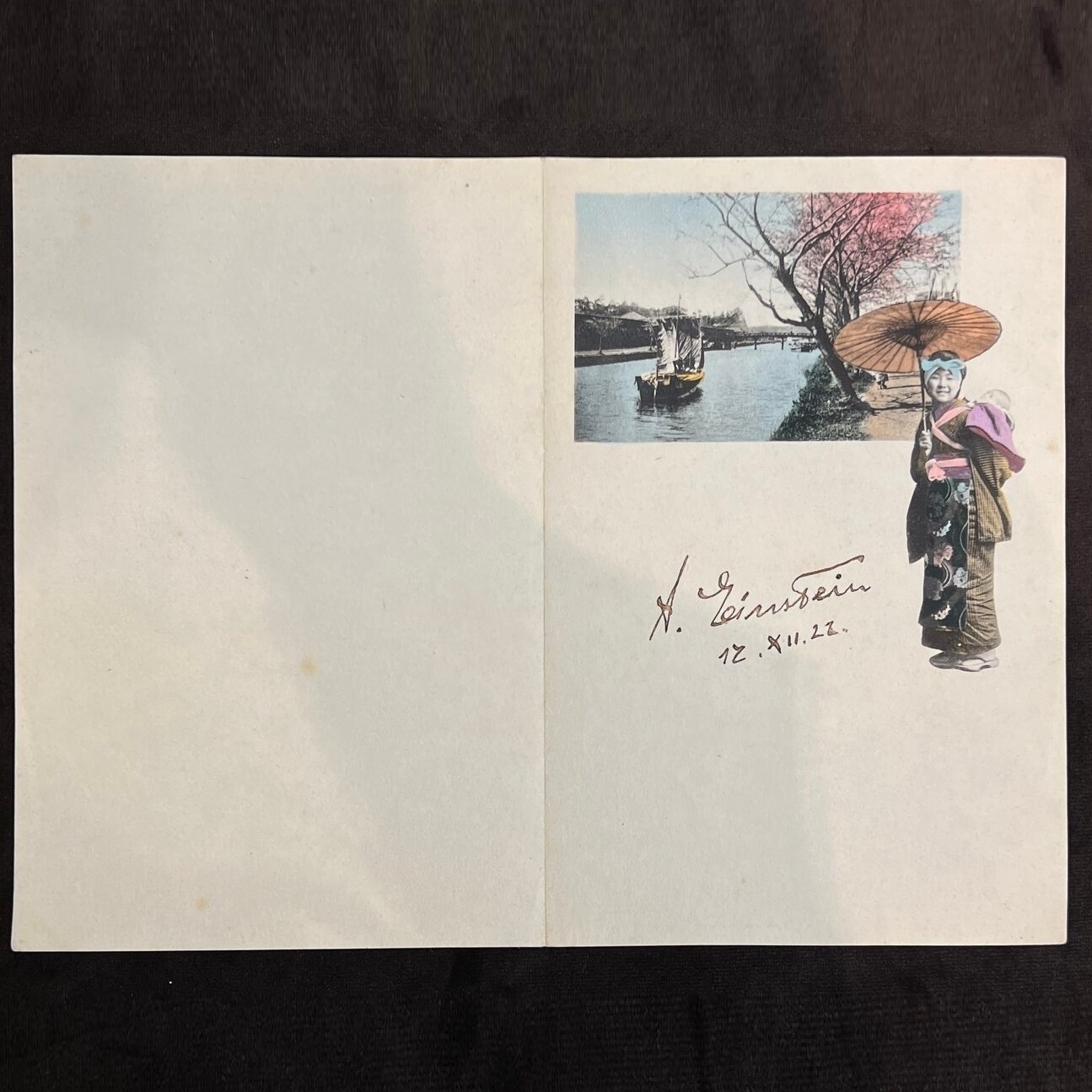 Редчайший коллекционный артефакт — открытка из замка Ниджо в Киото, подписанная рукой великого учёного. На чистом светлом фоне — цветная литография, изображающая японский пейзаж и женщину в традиционном кимоно, сдержанную, как сама философия Востока. В её правой руке — зонт, придающий сцене особый оттенок утончённости. Эта открытка несёт в себе отпечаток эпохи, когда Япония восхищённо принимала Эйнштейна, слушая его лекции, впитывая его идеи, встречая его с почестями, достойными императора науки.
