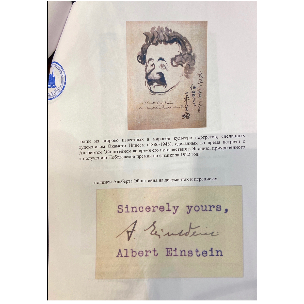 Гладкая бумага, искусная литография, филигранная каллиграфия его подписи — всё здесь дышит исторической подлинностью, становится мостом между прошлым и настоящим. Этот артефакт — больше, чем просто открытка. Он переносит во времена, когда человек, раскрывший тайны пространства и времени, шагал по улицам Киото, смотрел на цветущую сакуру, общался с восточными мыслителями, оставляя после себя не только научные труды, но и такие маленькие, драгоценные следы своего пребывания.
