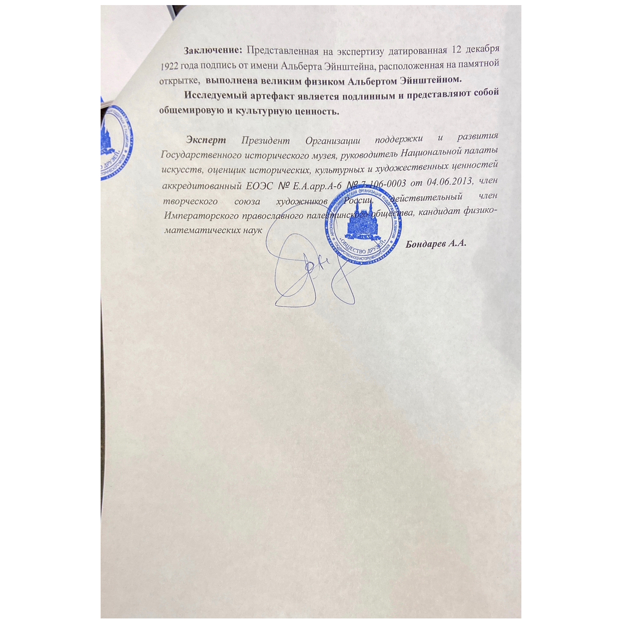 Сопровождающий документ Государственного исторического музея подтверждает подлинность экспоната, но его ценность выходит далеко за рамки экспертных заключений. Это возможность прикоснуться к истории, стать обладателем не просто артефакта, а части мира Эйнштейна. Перед вами символ власти над временем, власти над прошлым, элитарного доступа к реликвии, перед которой склоняются даже музеи. Это интеллектуальный вызов, знак принадлежности к кругу избранных. Исключительный по значимости, он не только имеет материальную ценность, но и предлагает глубочайшую эмоциональную связь с одной из самых ярких личностей XX века. Это история, застывшая в чернилах, воплощённая в бумаге и сохранённая для тех, кто умеет видеть сквозь века.