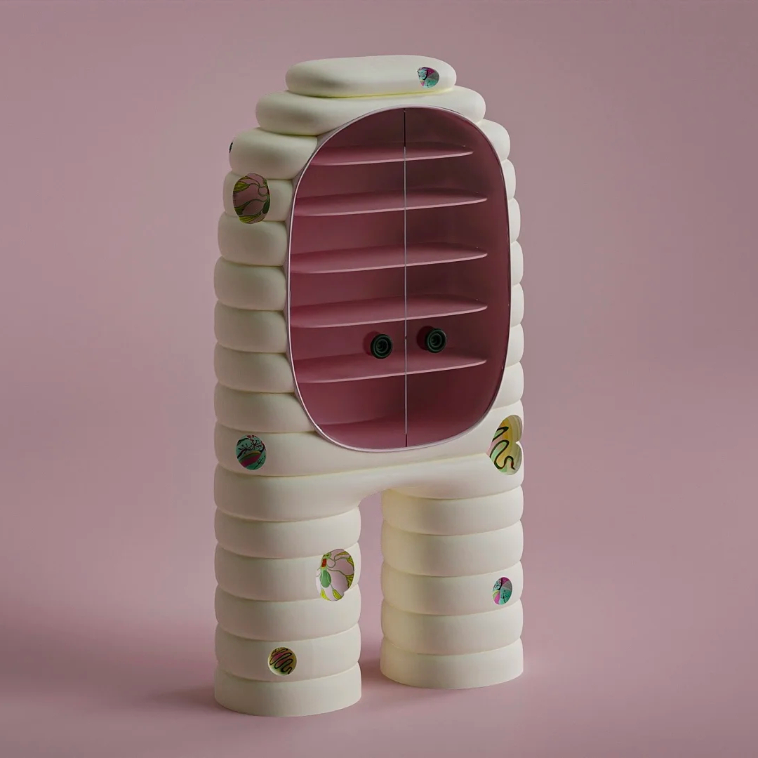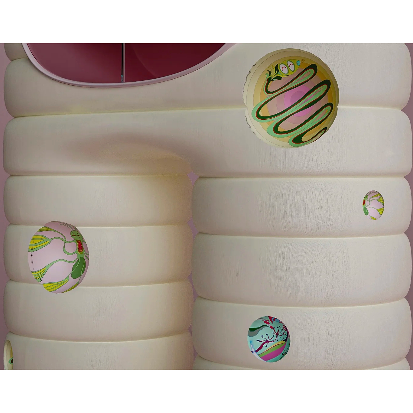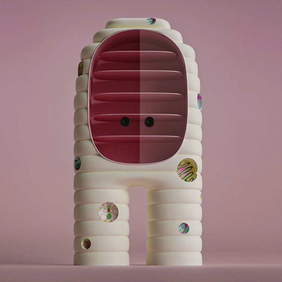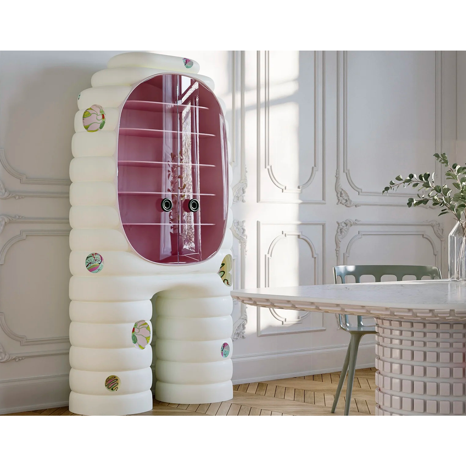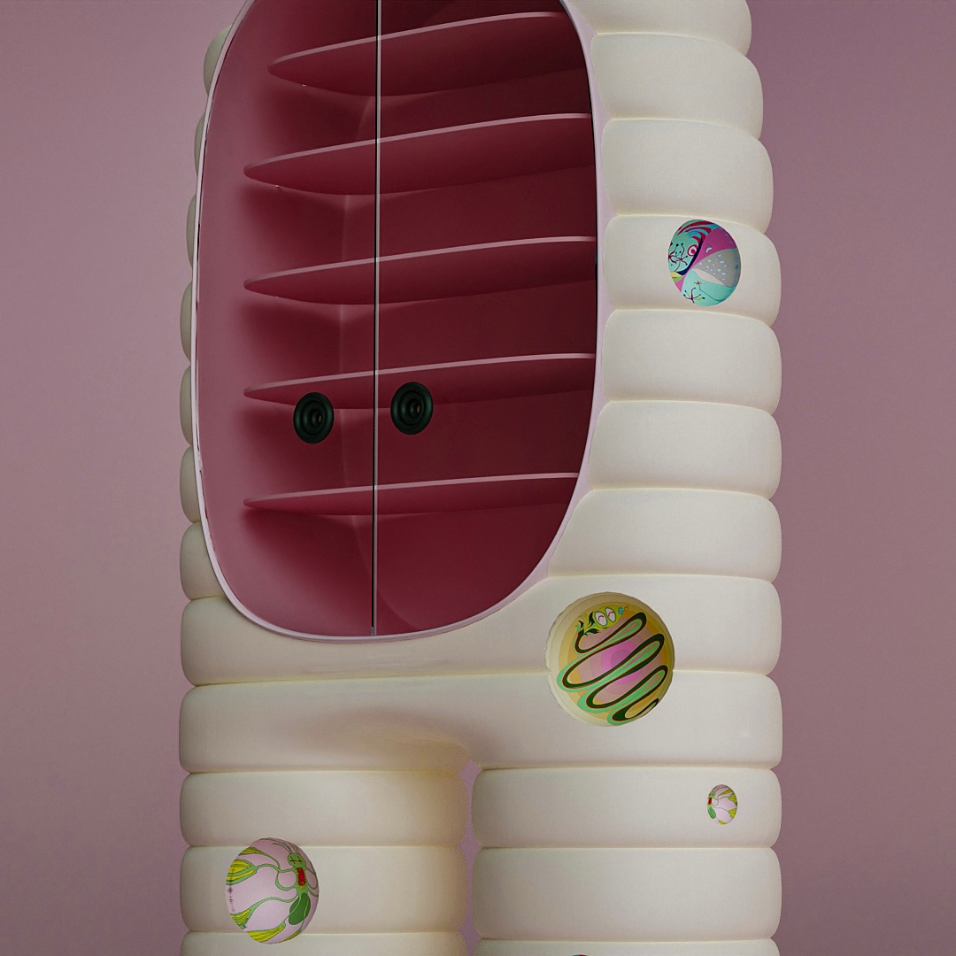 Массивное тело буфета, напоминающее доисторический монумент, словно хранит в себе загадки мира Yoomoota. С его поверхности смотрят таинственные символы — капсулы памяти, заключенные в идеальные сферические формы. Эти разноцветные вкрапления, напоминающие осколки ушедших эпох, оживают в лучах света, отражая загадочные узоры древних существ. Центральный отсек буфета, скрытый за полупрозрачными створками, напоминает визор таинственного стража, чей долг — оберегать самое ценное.