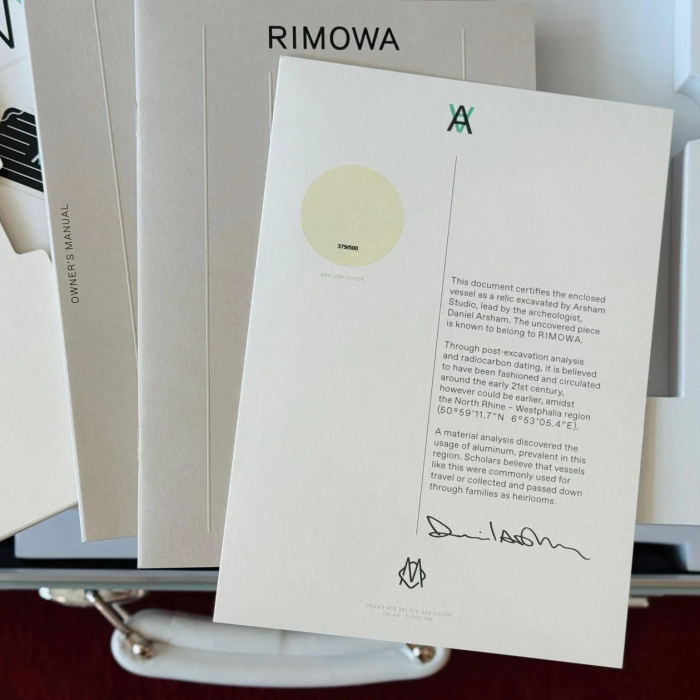 Лимитированная скульптура RIMOWA, подписанный рисунок, персональное письмо художника со специальным набором багажных стикеров, разработанных RIMOWA вместе с Даниэлем Аршамом