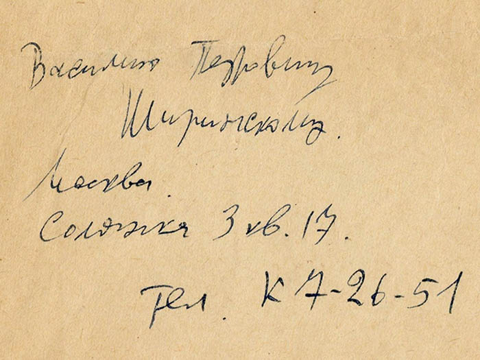 Текст гласит: «Василию Петровичу Ширинскому Москва Солянка 3 кв. 17 тел, к. 7-26-51»