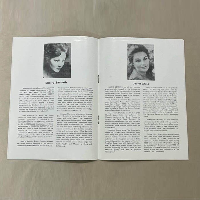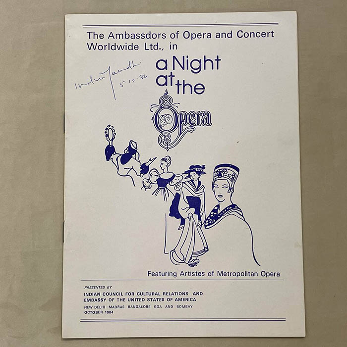 Брошюра с автографом от 5 октября 1984 года, выпущенная по случаю мероприятия «A Night at the Opera», проводившегося в знаменитом нью-йоркском театре Метрополитен-опера на Бродвее. Событие было приурочено укреплению культурных связей между Индией и США.