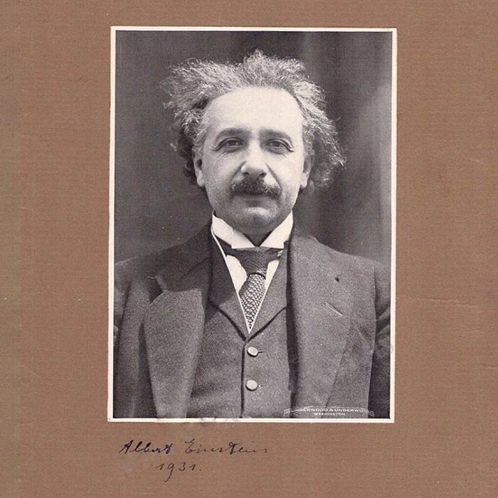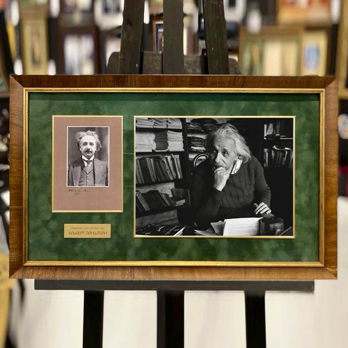Чистота линий, гармония композиции, изысканный контраст черно-белой пленки — здесь все подчинено эстетике ума, воплощенной в образе одного из величайших людей всех времен. Рядом с фотографией — подлинный автограф, оставленный рукой, выведшей знаменитое уравнение E=mc². Эти несколько букв — не просто чернильный штрих, а символ интеллектуальной власти, знак принадлежности к миру, в котором гений — единственная валюта, не теряющая ценности.