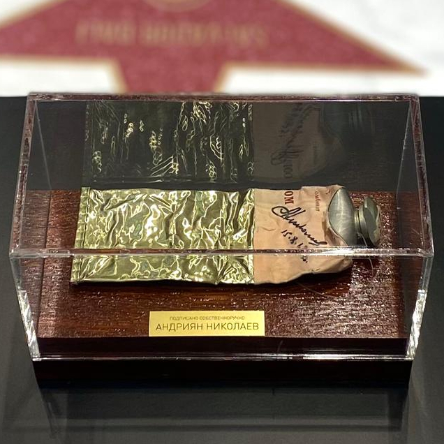 Использованный тюбик космического питания с автографом космонавта Андрияна Николаева