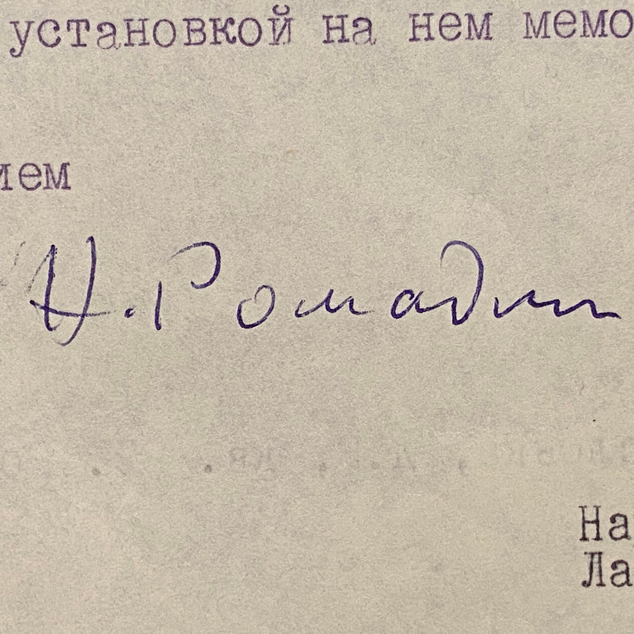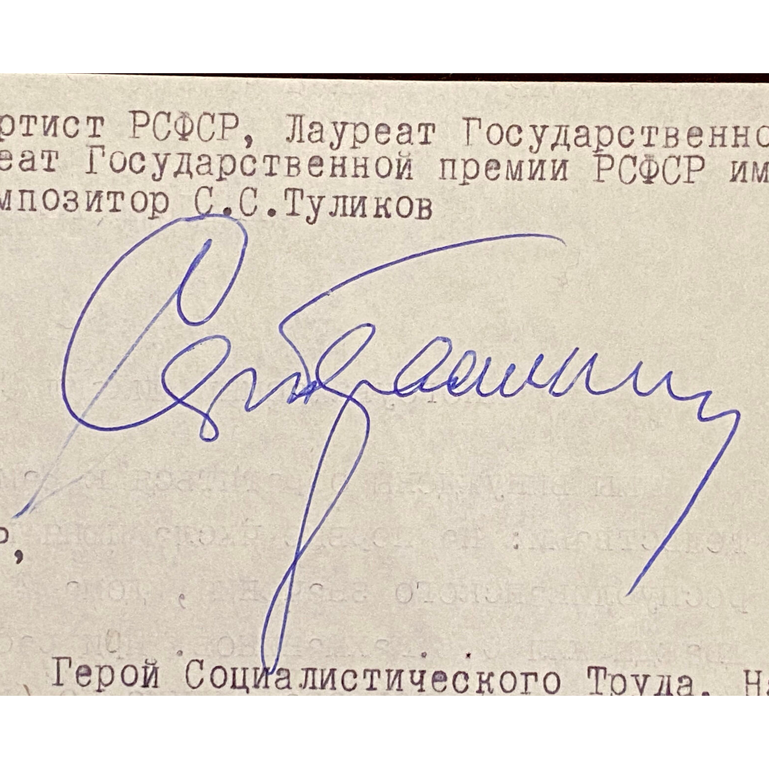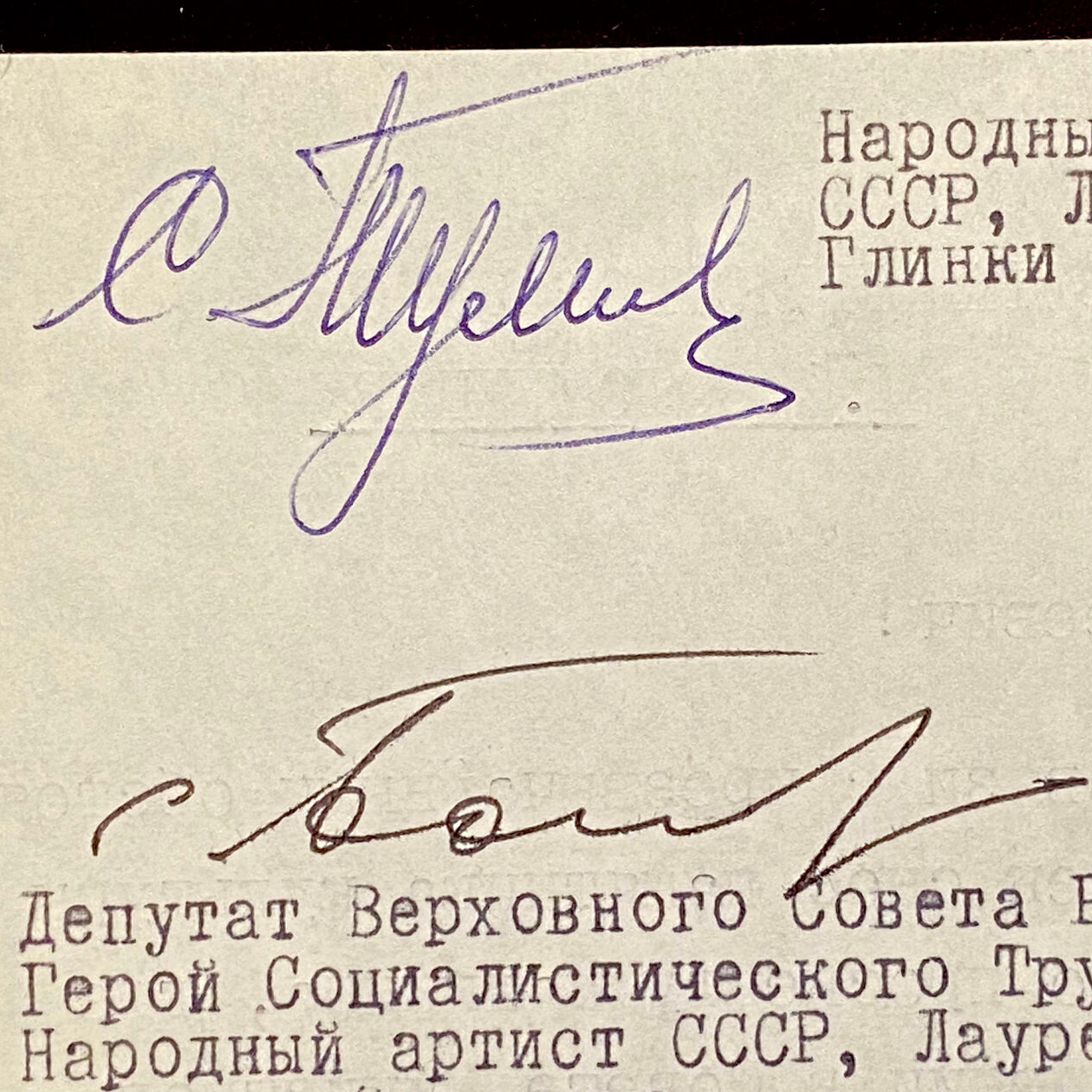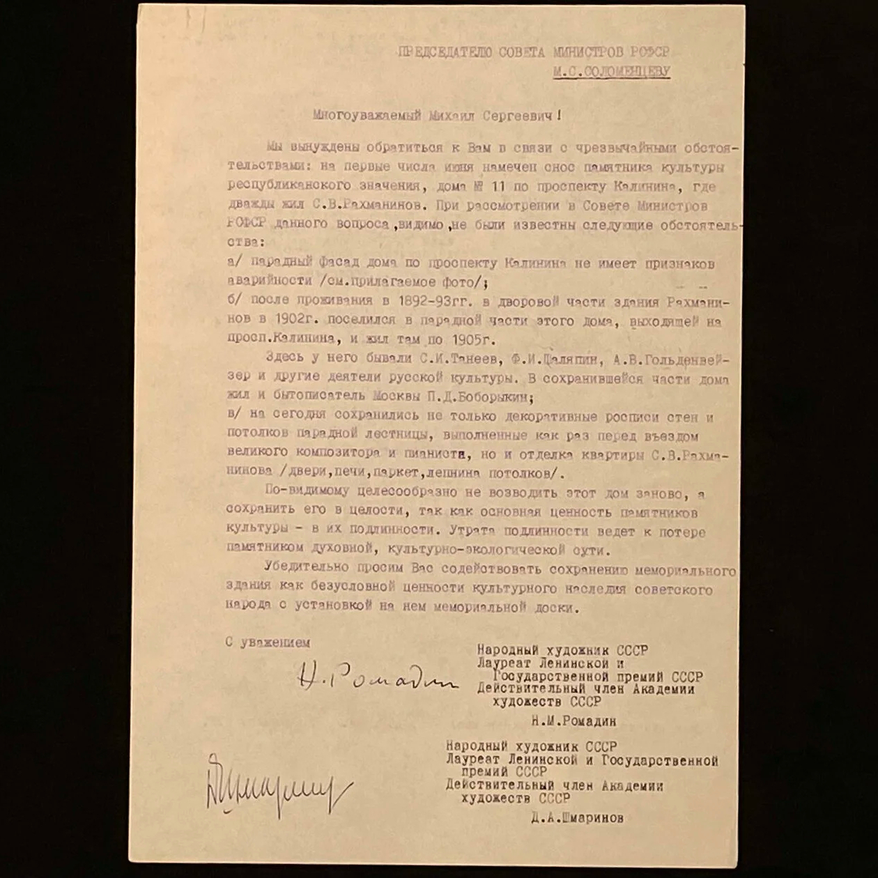 Машинописное письмо с автографами деятелей культуры к председателю совета министров РСФСР М.С. Соломенцеву о сохранении дома, в котором жил Сергей Рахманинов.