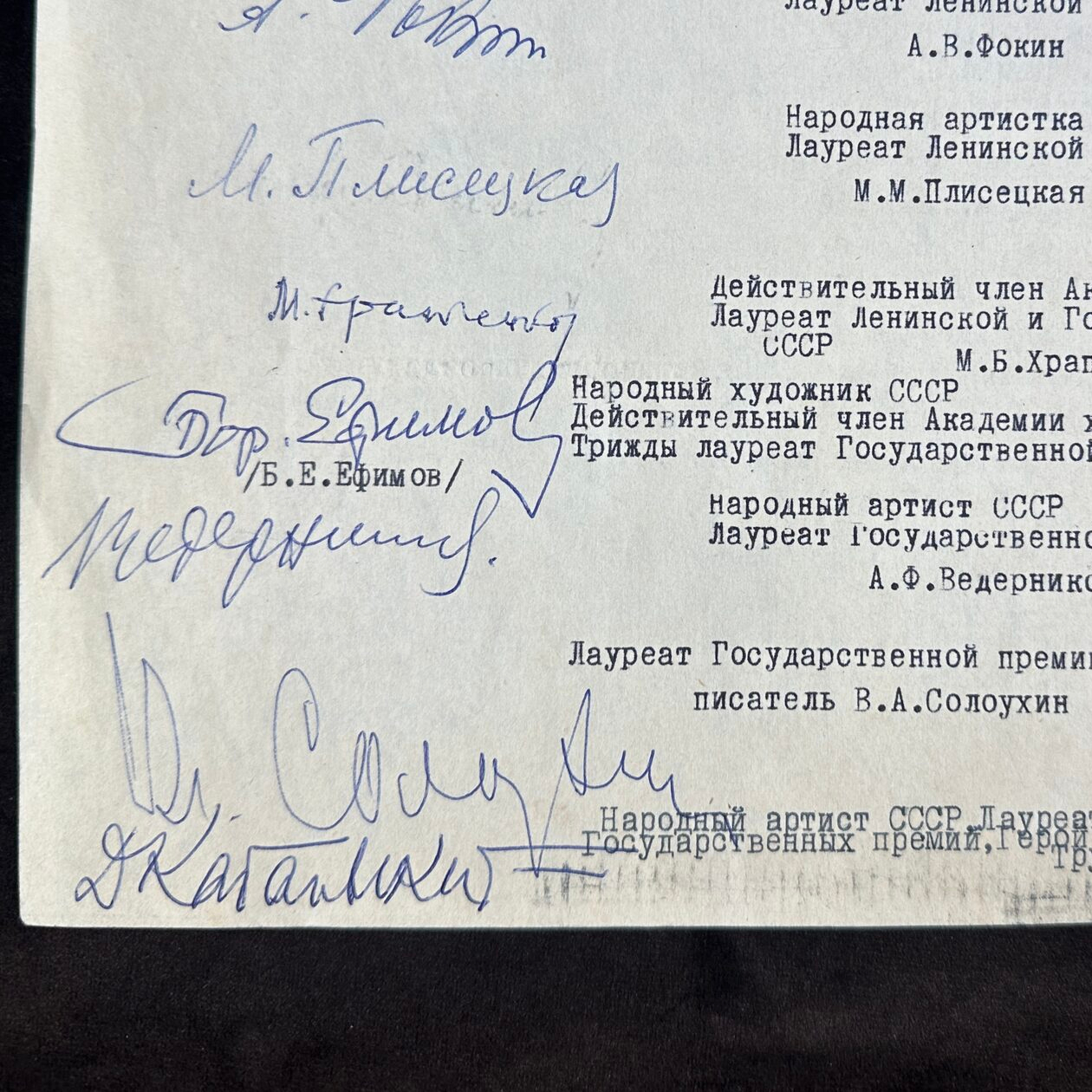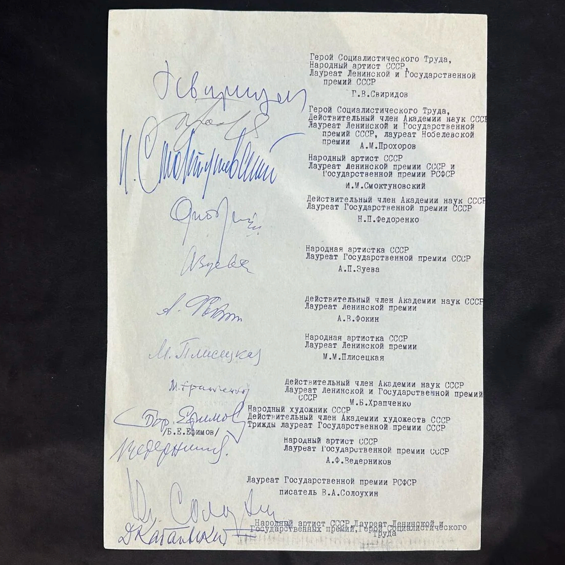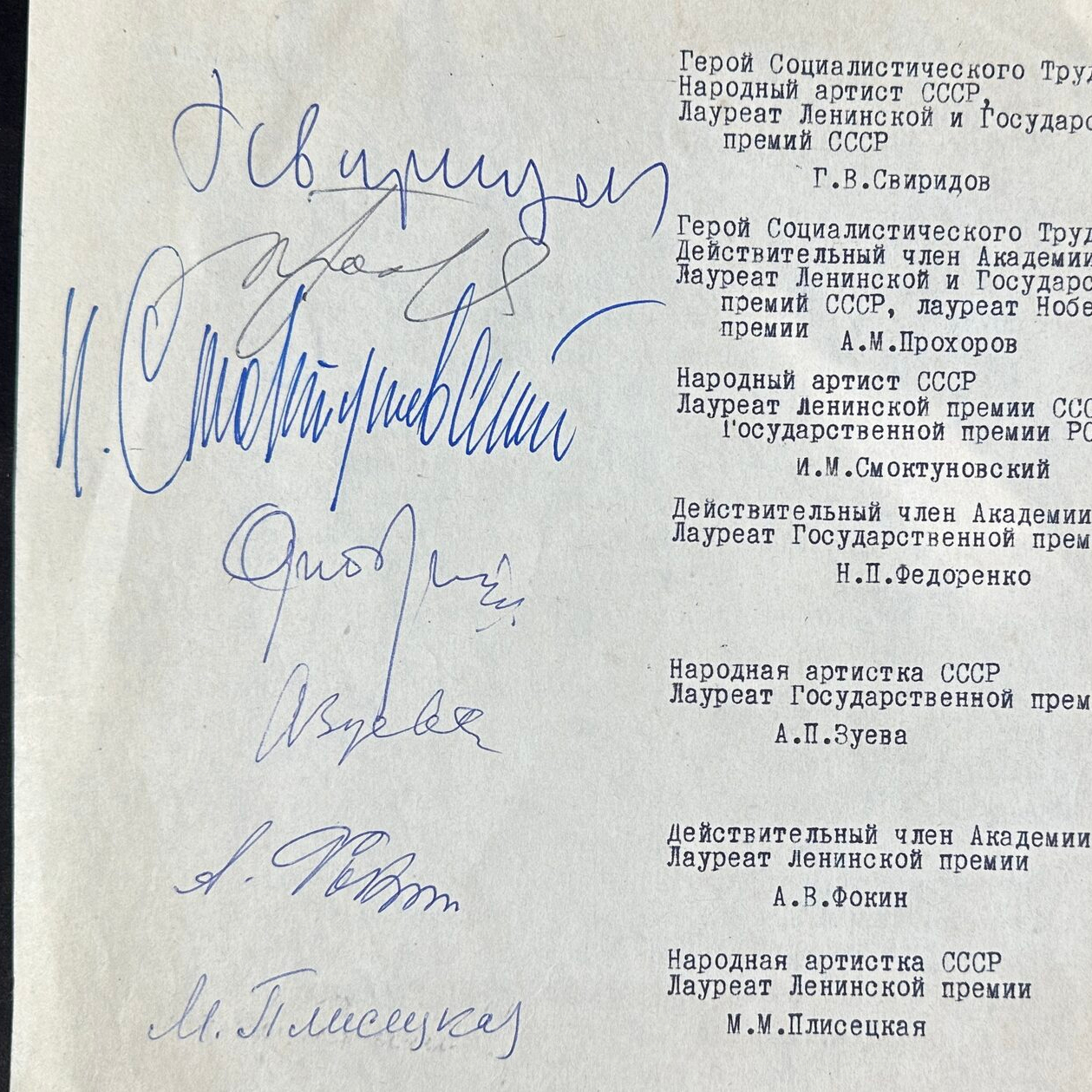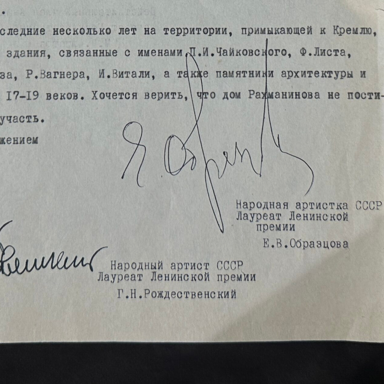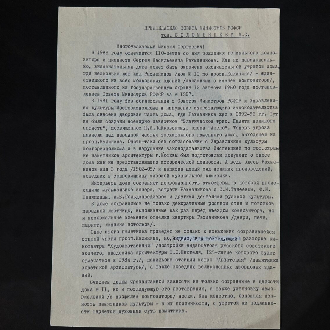 Машинописное письмо с автографами деятелей культуры к председателю Совета министров РСФСР Соломенцеву М.С. о сохранении московского дома, в котором жил Сергей Рахманинов