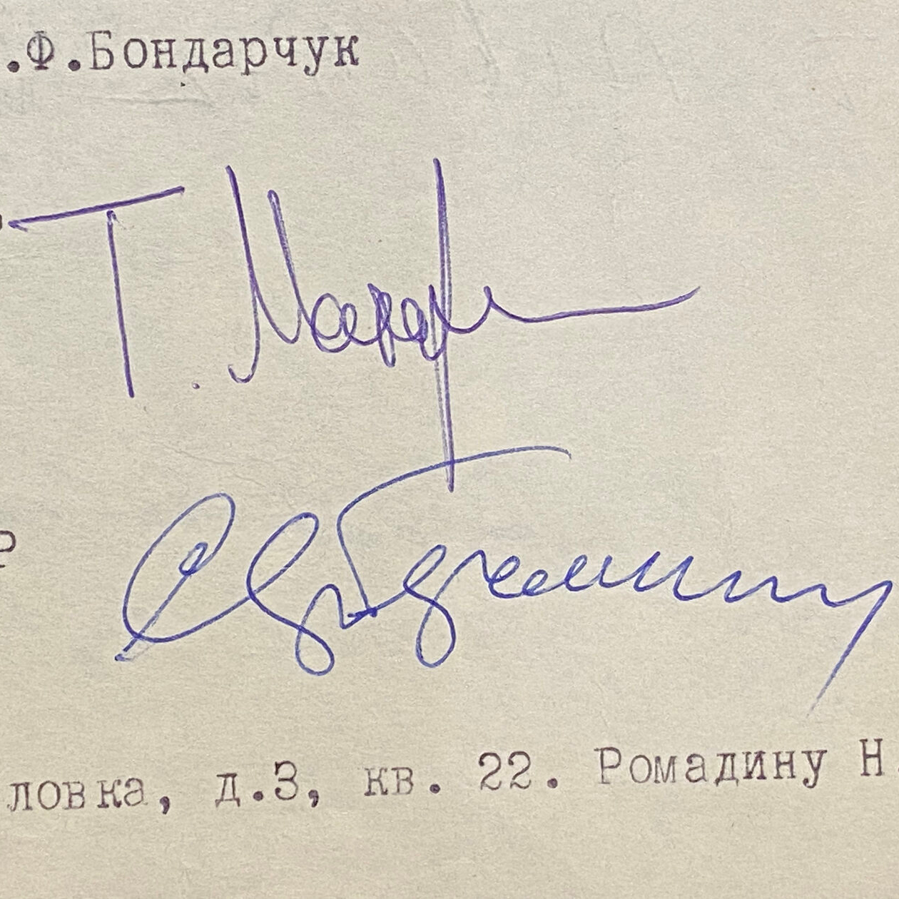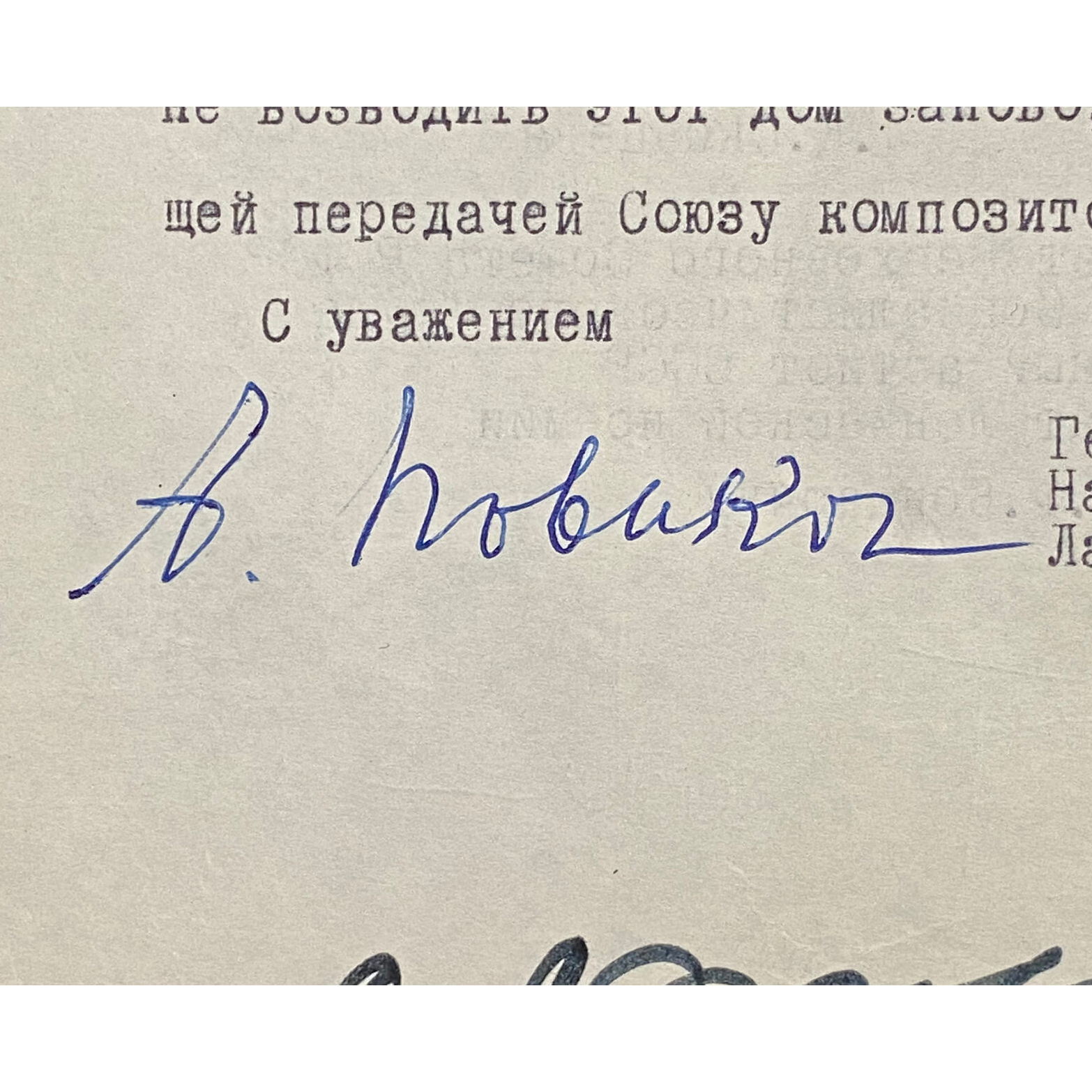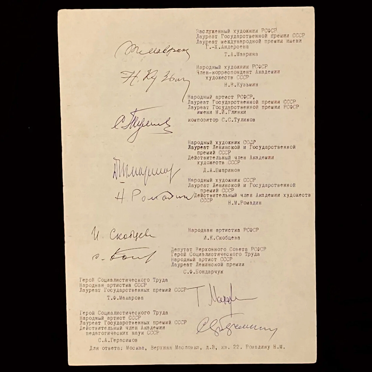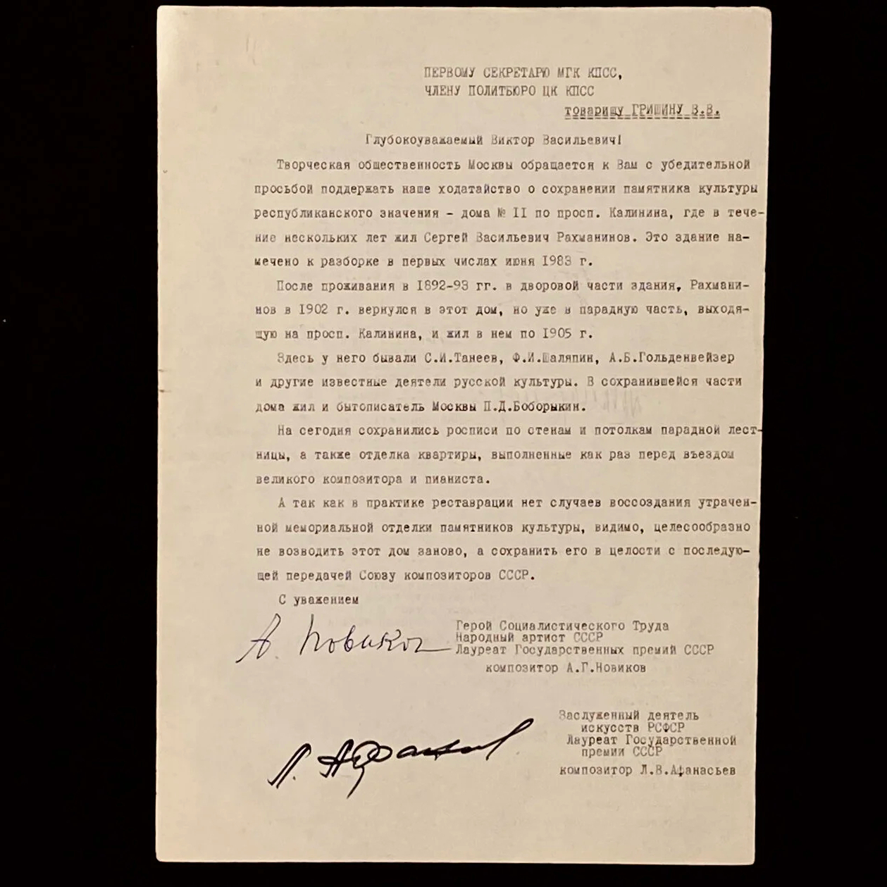Машинописное письмо с автографами деятелей культуры к первому секретарю МГК КПСС В.В. Гришину о сохранении московского дома, в котором жил Сергей Рахманинов.