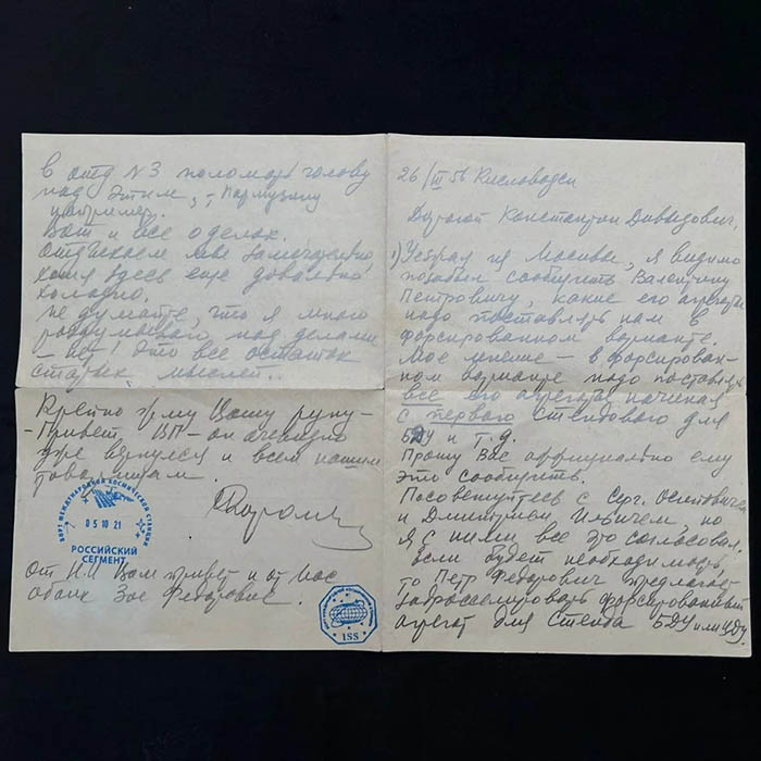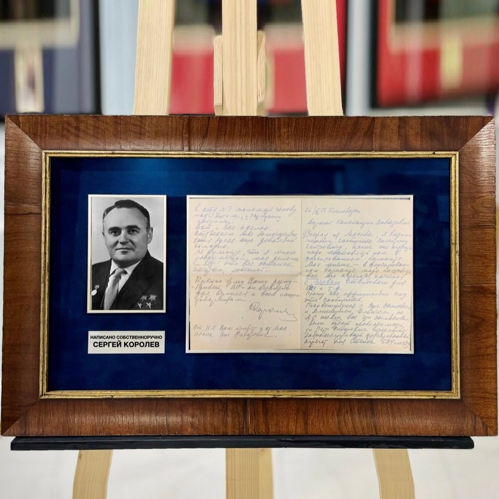 Письмо Королёва Сергея Павловича, датированное 1956 годом, адресовано советскому учёному в области ракетно-космической технике Бушуеву Константину Давыдовичу. Судя по дате, речь идет о подготовке запуска первого спутника в 1957 году. В тексте упоминаются многие личности, сыгравшие важнейшую роль в развитии космонавтики: Глушко Валентин Петрович, Охапкин Сергей Осипович, Козлов Дмитрий Ильич, Пармузин Семён Филлипович и другие.