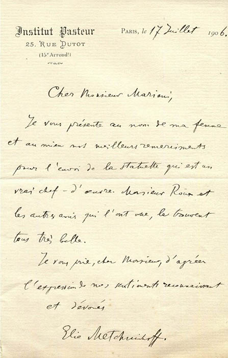 Он использовал бланк Института Пастера, в котором с 1904 года числился в должности вице-директора. В 1888 году биолог покинул Россию и переехал в Париж, где ему была предоставлена лаборатория в созданном Луи Пастером институте. Интересно, что Мечников был первым, кого Пастер пригласил работать в только что созданный институт. Там Мечников был занят работой, связанной с его теорией клеточного иммунитета, которая, как и многие крупные открытия, вызвала серьезную полемику.