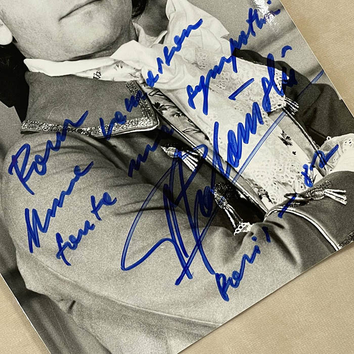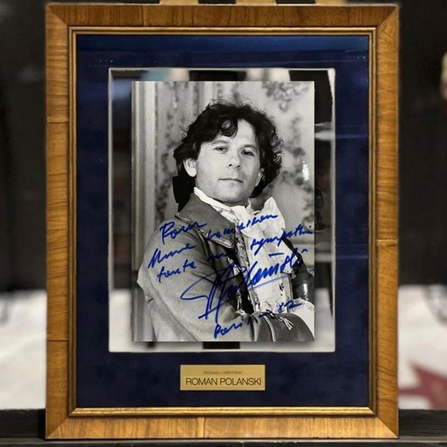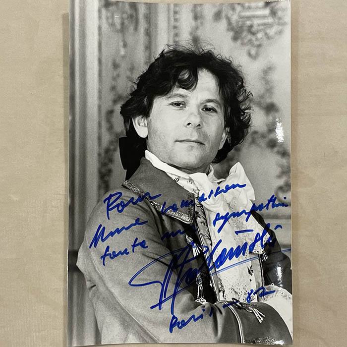 Черно-белая фотография, подписанная Романом Полански в театре Мариньи в Париже, когда был поставлен «Амадей» по Питеру Шефферу, где Полански присутствовал в качестве театрального режиссёра и исполнителя главной роли - Моцарта. Этот спектакль был поставлен трижды: в 1981 в Варшаве и Париже, в 1999 в Милане.