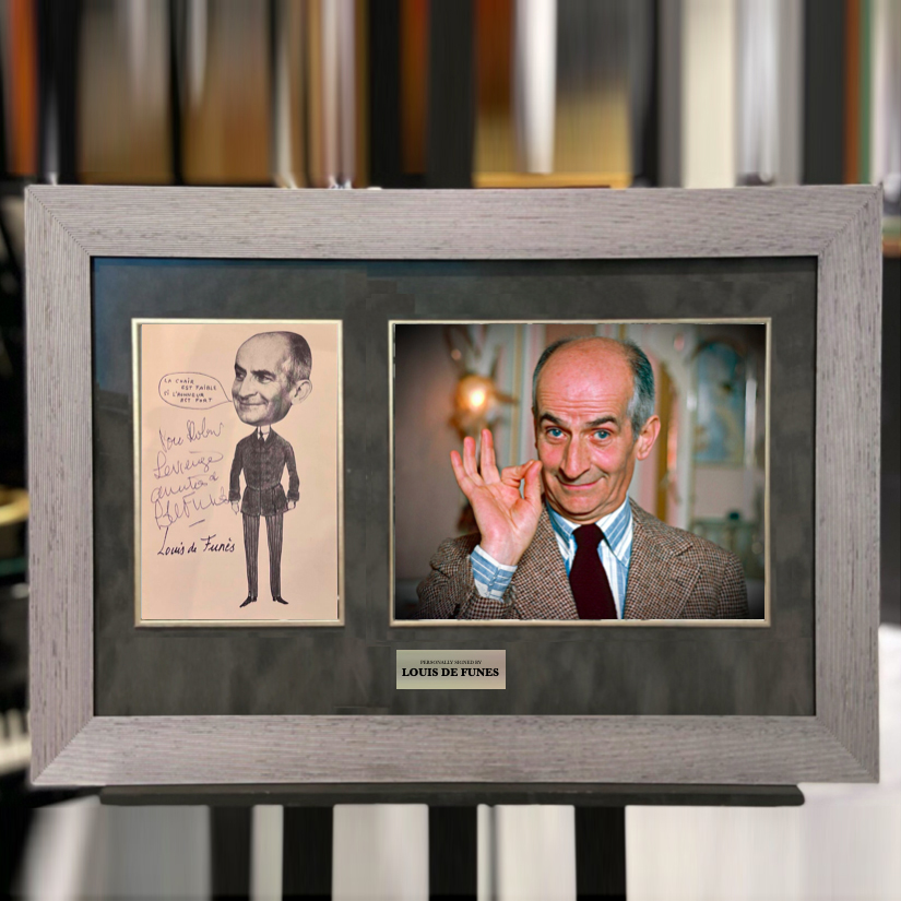 Карикатура с рукописным обращением и автографом Луи де Фюнеса