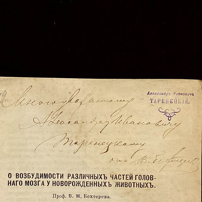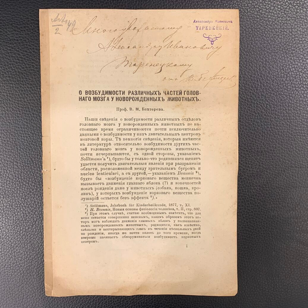 Книга «О возбудимости различных частей головного мозга у новорождённых животных» с автографом и рукописным пожеланием Владимира Бехтерева