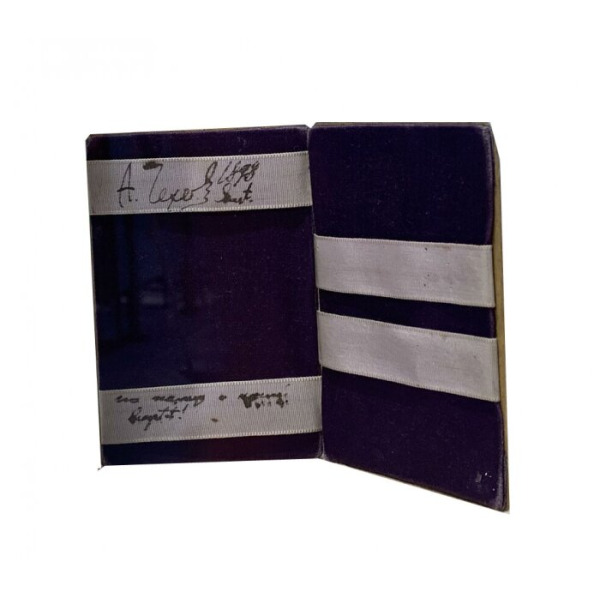 Деревянная обложка, украшенная тонкой инкрустацией цветочных мотивов, словно перекликается с легкостью и меланхолией, звучащими в чеховской прозе. Внутри — глубокий бархат, чьи складки хранили визитные карточки писателя, а возможно, и записки, оставленные в минуты литературных раздумий. На шелковых лентах — его собственные надписи, сделанные рукой, подарившей миру "Чайку", "Вишневый сад" и "Три сестры". Верхняя лента хранит четкие строки: "A. Чехов 1898 Siest", словно след безмятежного отдыха на юге Франции, где Чехов проводил зиму 1897–1898 годов. Чуть ниже, на второй ленте, проступают слова: "на память о нашей buytot" — след мимолетного мгновения, застывшего в чернилах, возможно, отголосок давней покупки, намек на историю, известную лишь посвященным.