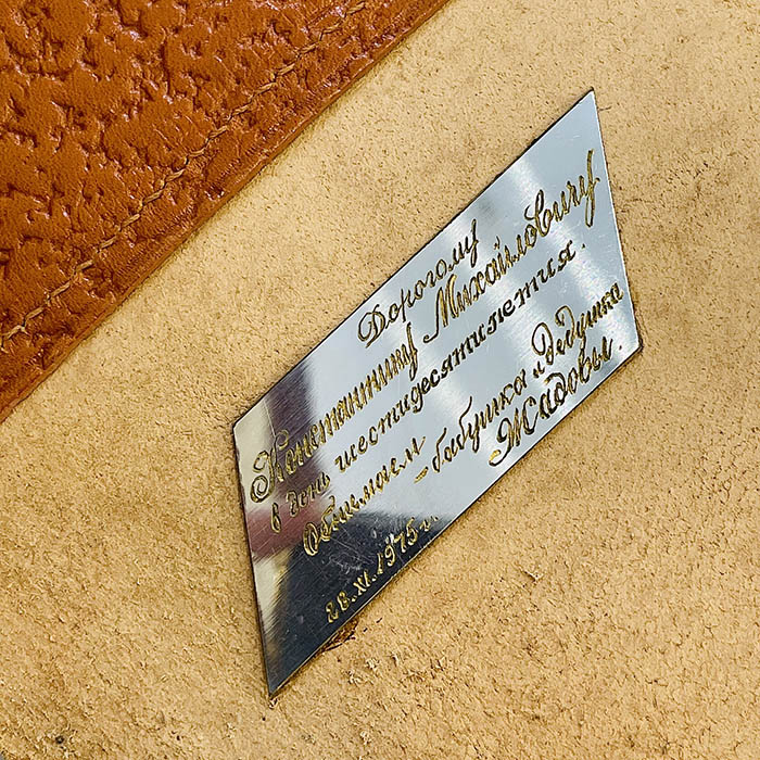 На внутренней стороне портфеля металлическая пластина с дарственной надписью: «Дорогому Константину Михайловичу в день шестидесятилетия. Обнимаем — бабушка и дедушка Жадовы. 28.XI.1975 г.». Присутствуют потертости на выступающих поверхностях.